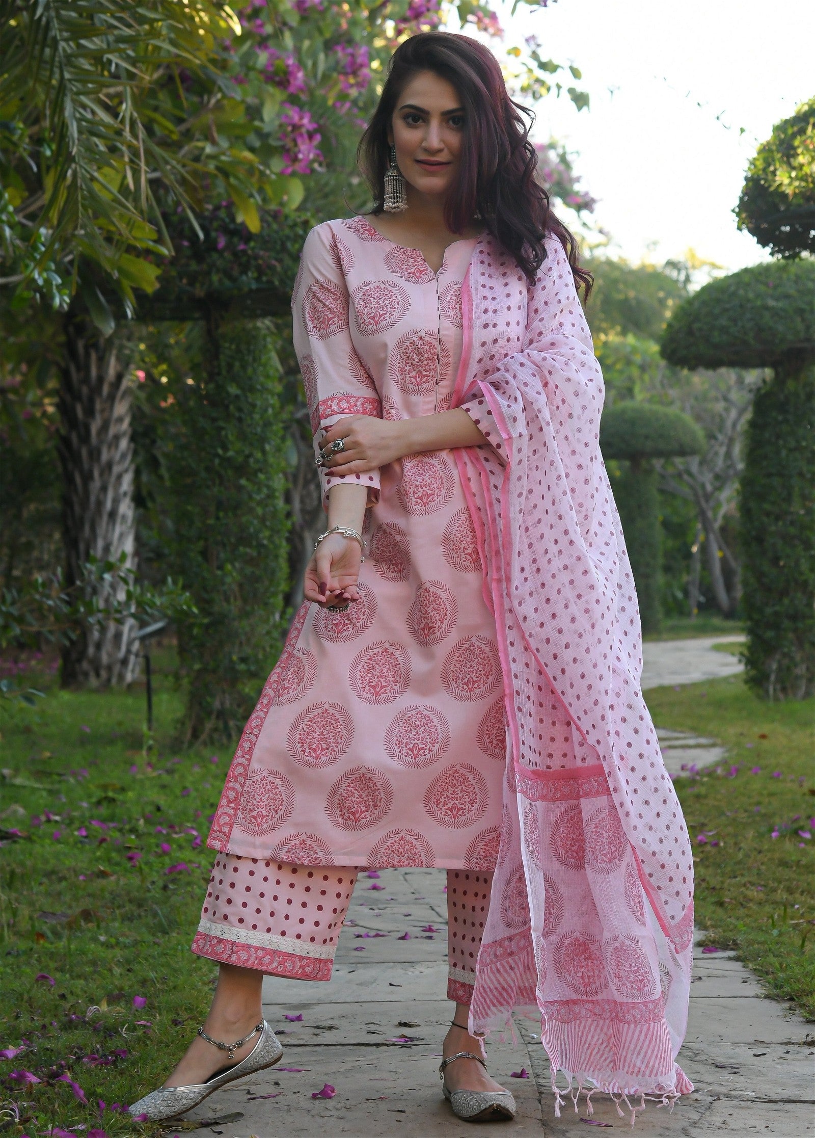 Baby Pink Printed Fancy Kurti With Bottom Dupatta set