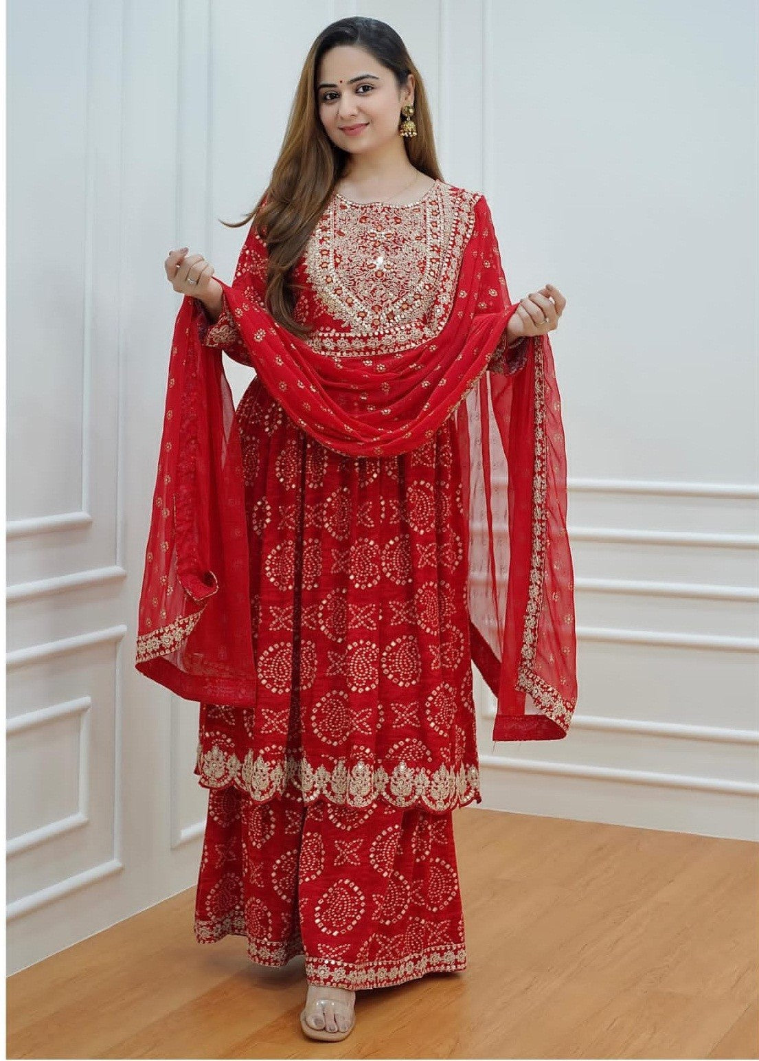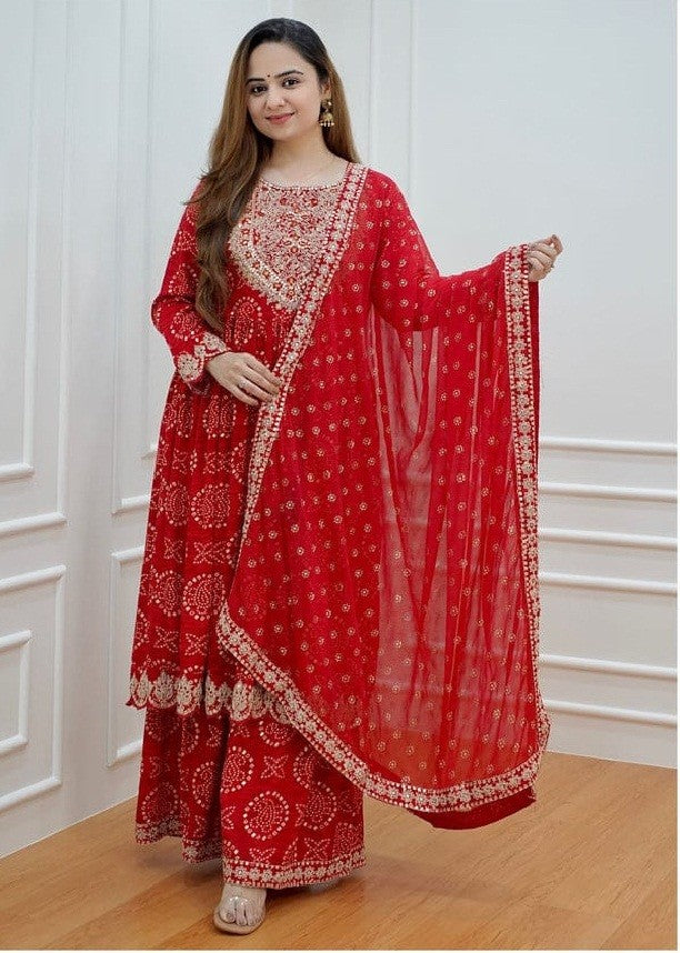 Bandhani Gold zari Embroidery and Sequence Work Red Color Kurti With Sharara & Dupatta Suit Set