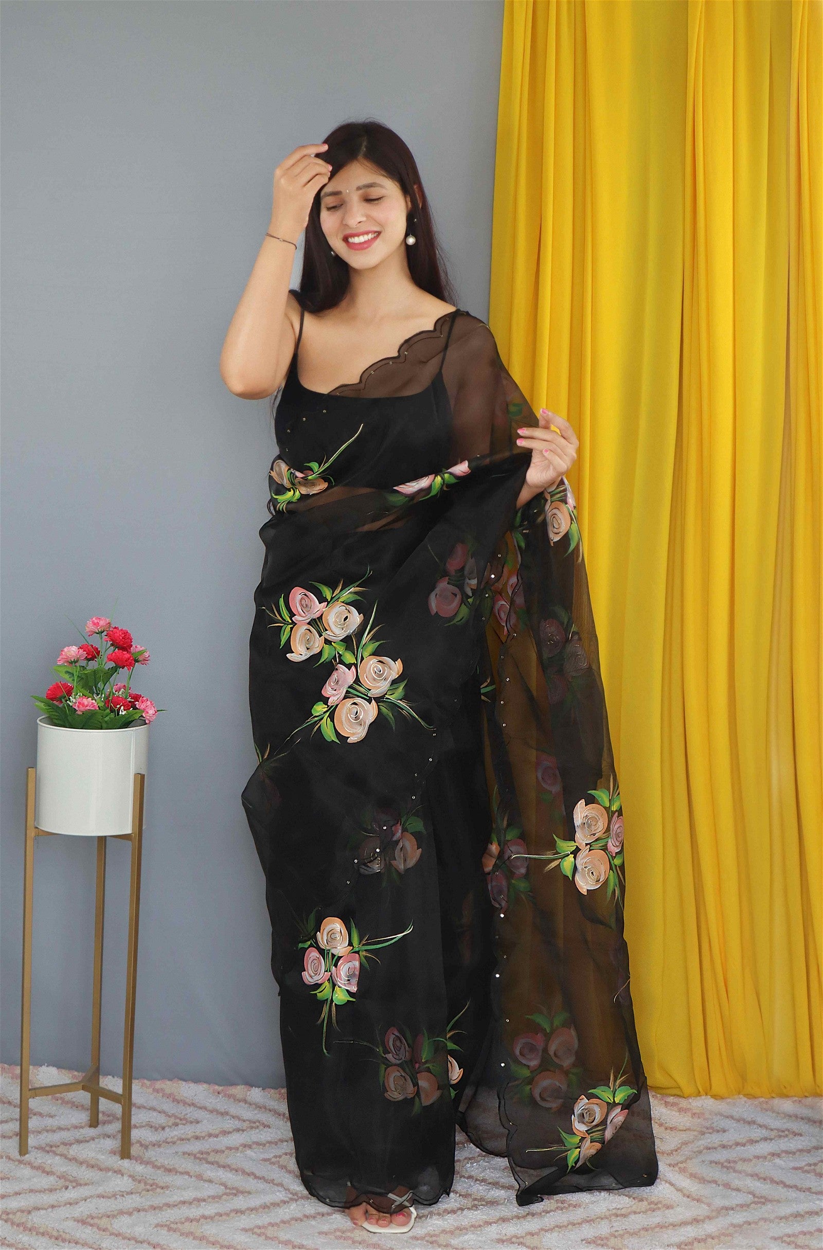 Black Colour Nylon Organza Hand Print With Foil Work Saree For Women's