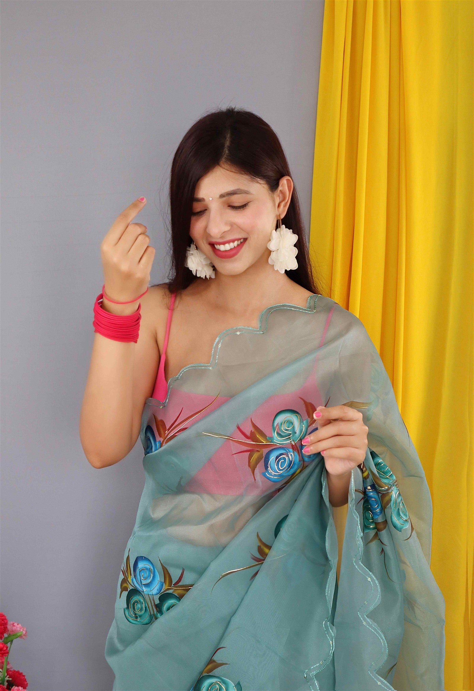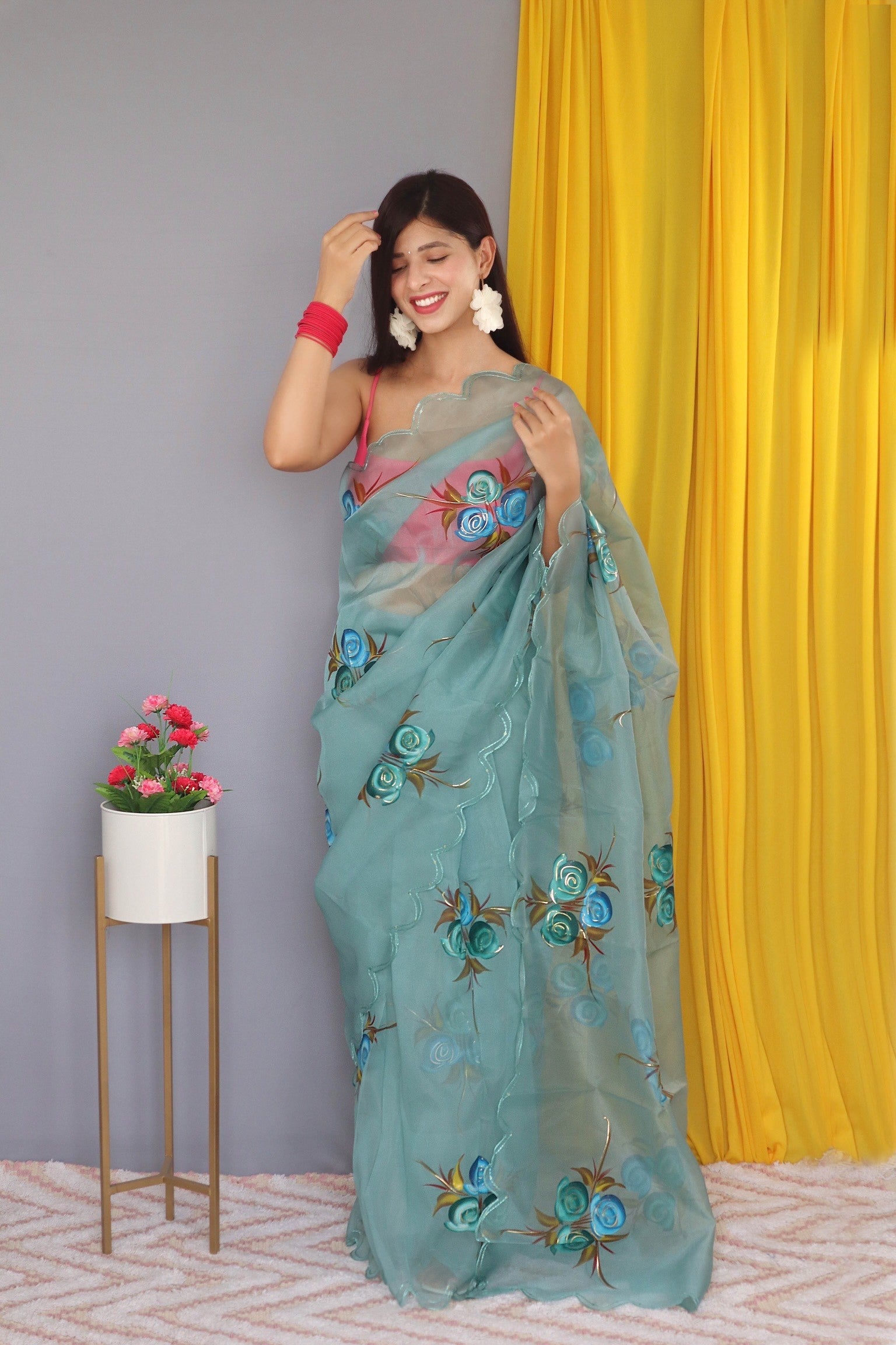 Blue Colour Nylon Organza Hand Print With Foil Work Saree For Women's