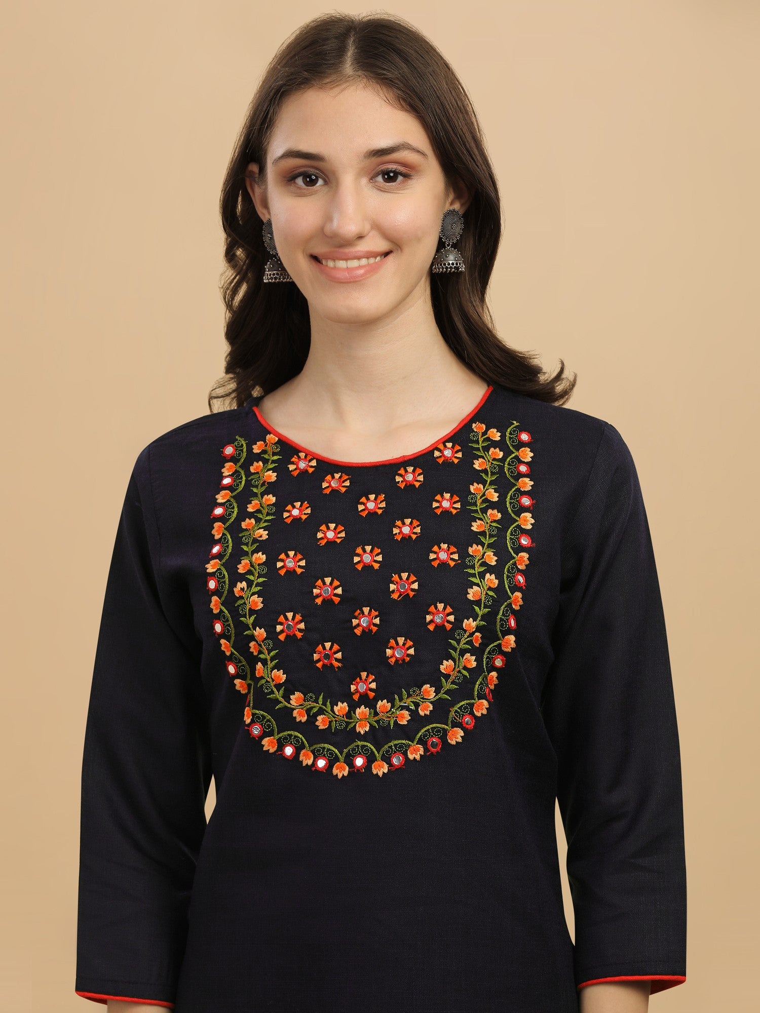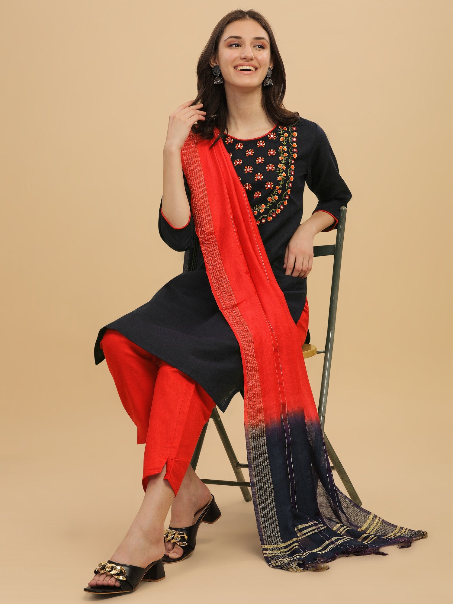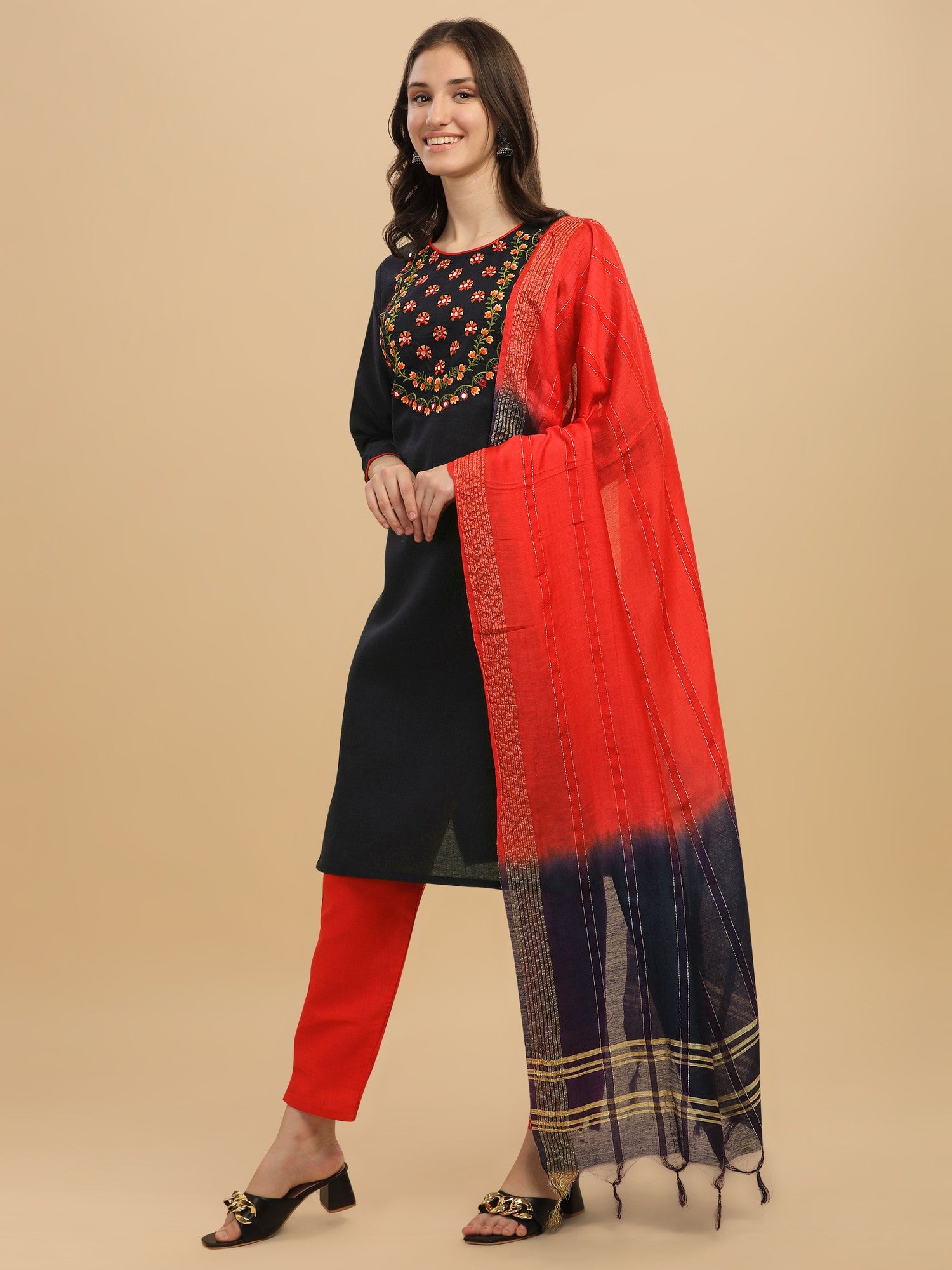 Blue Colour Slub Cotton Embroidery Casual Wear Kurta Pant Dupatta Set For Women's