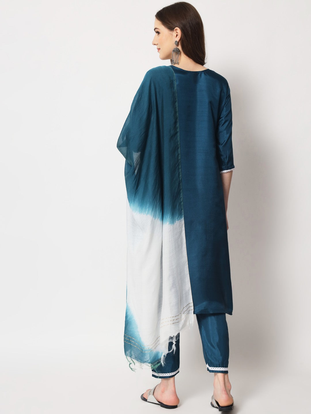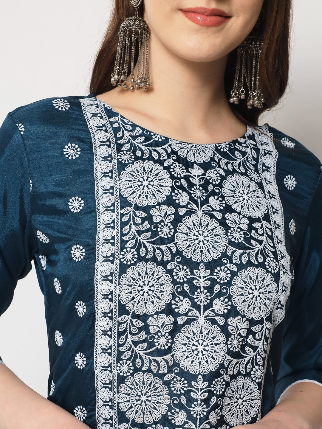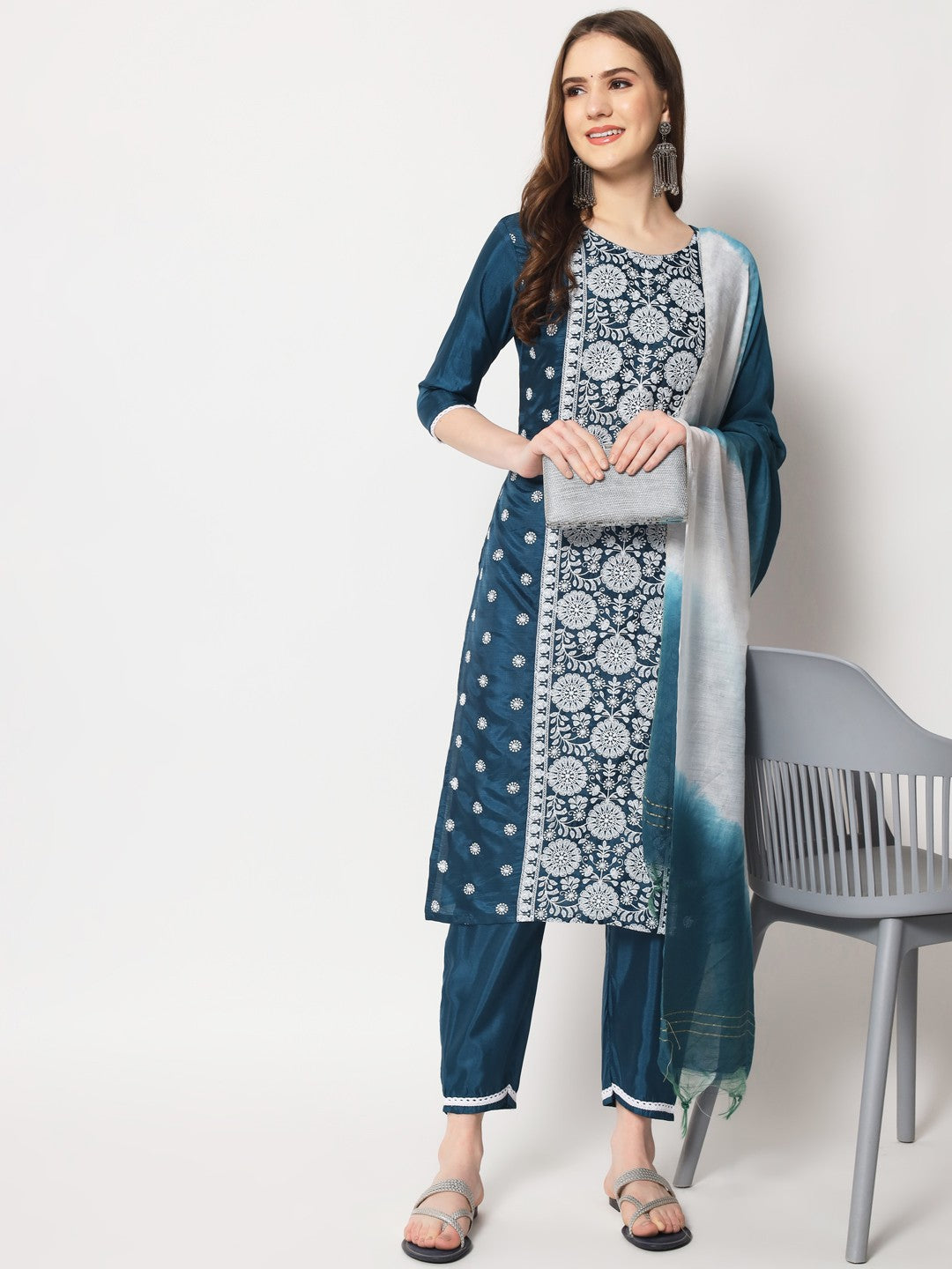Blue Colour South Silk Embroidery Work Casual Wear Kurta Pant Dupatta Set For Women's
