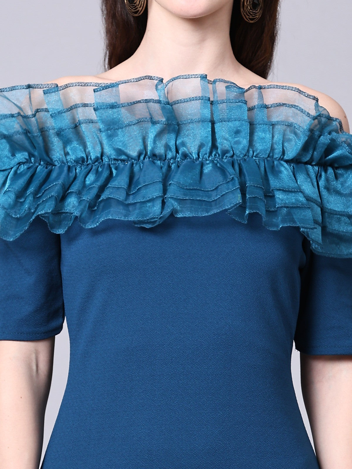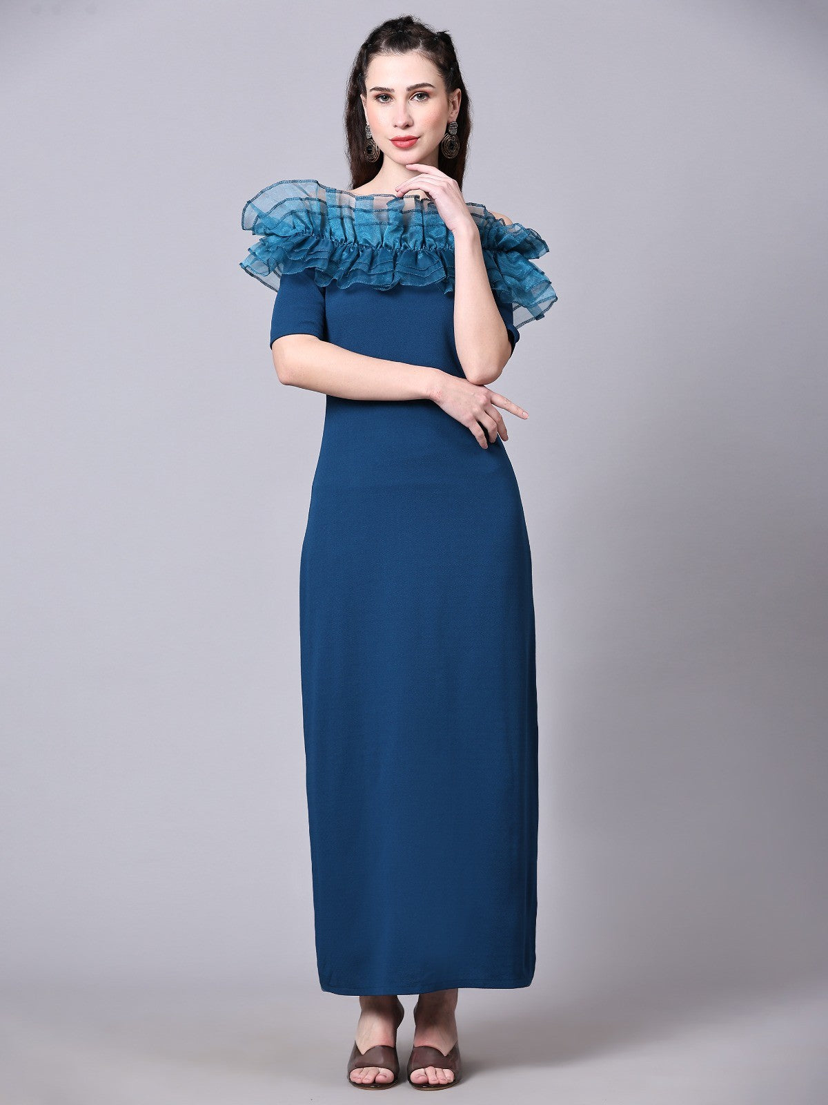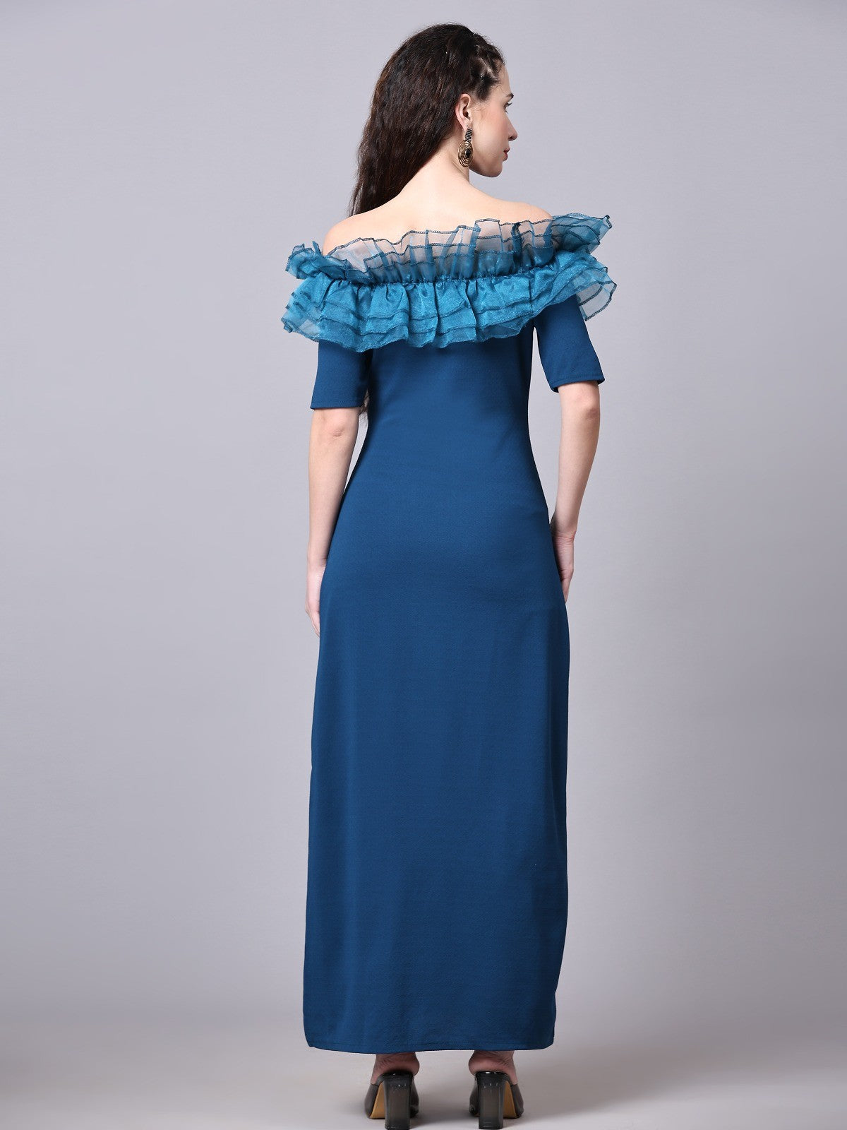 Blue Designer Cotton Lycra Off Shoulder Women's Regular Fit Dress