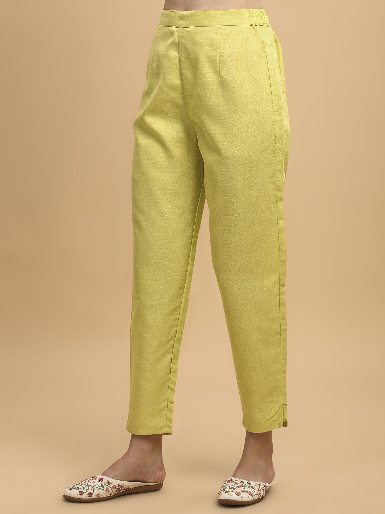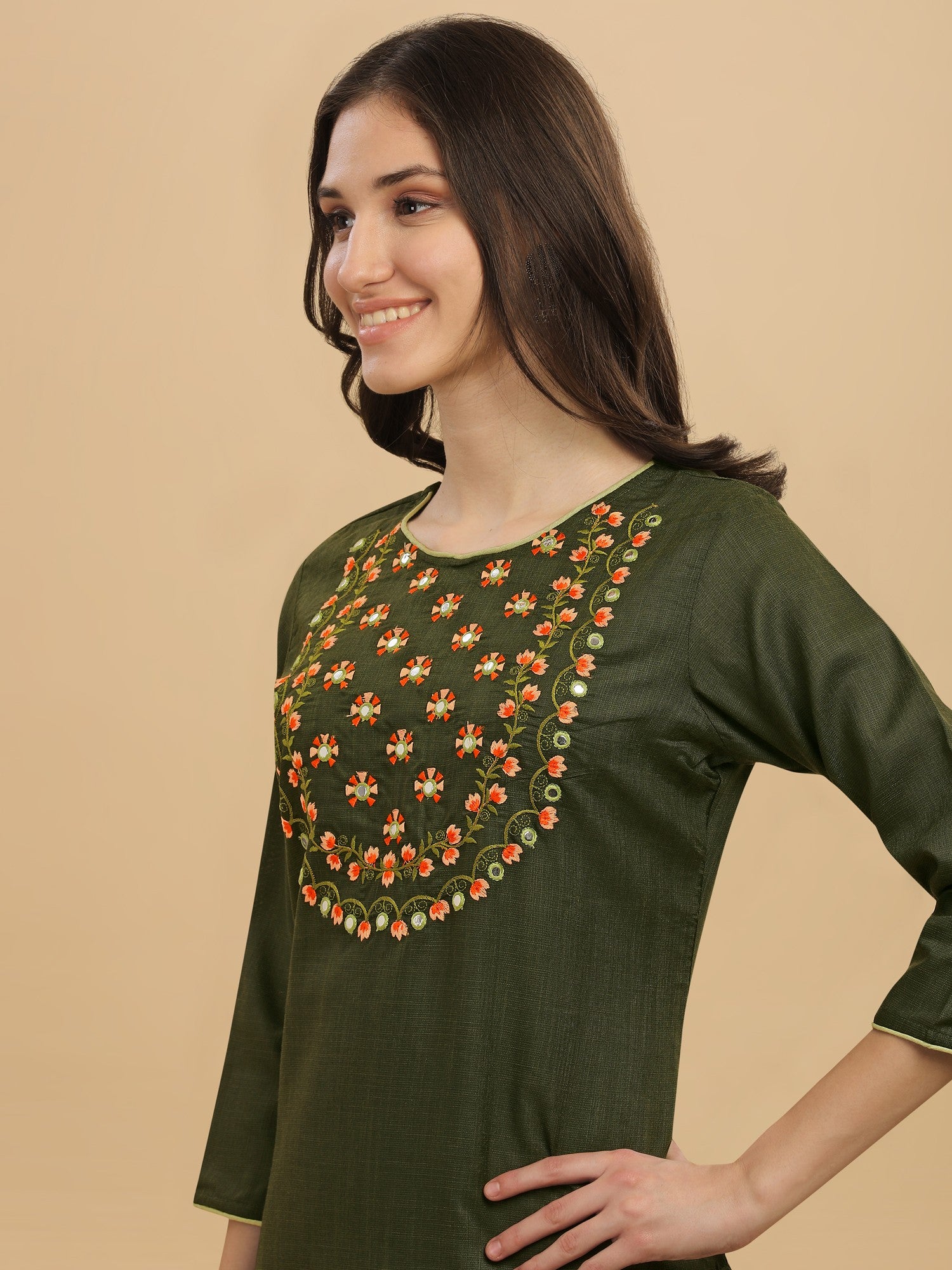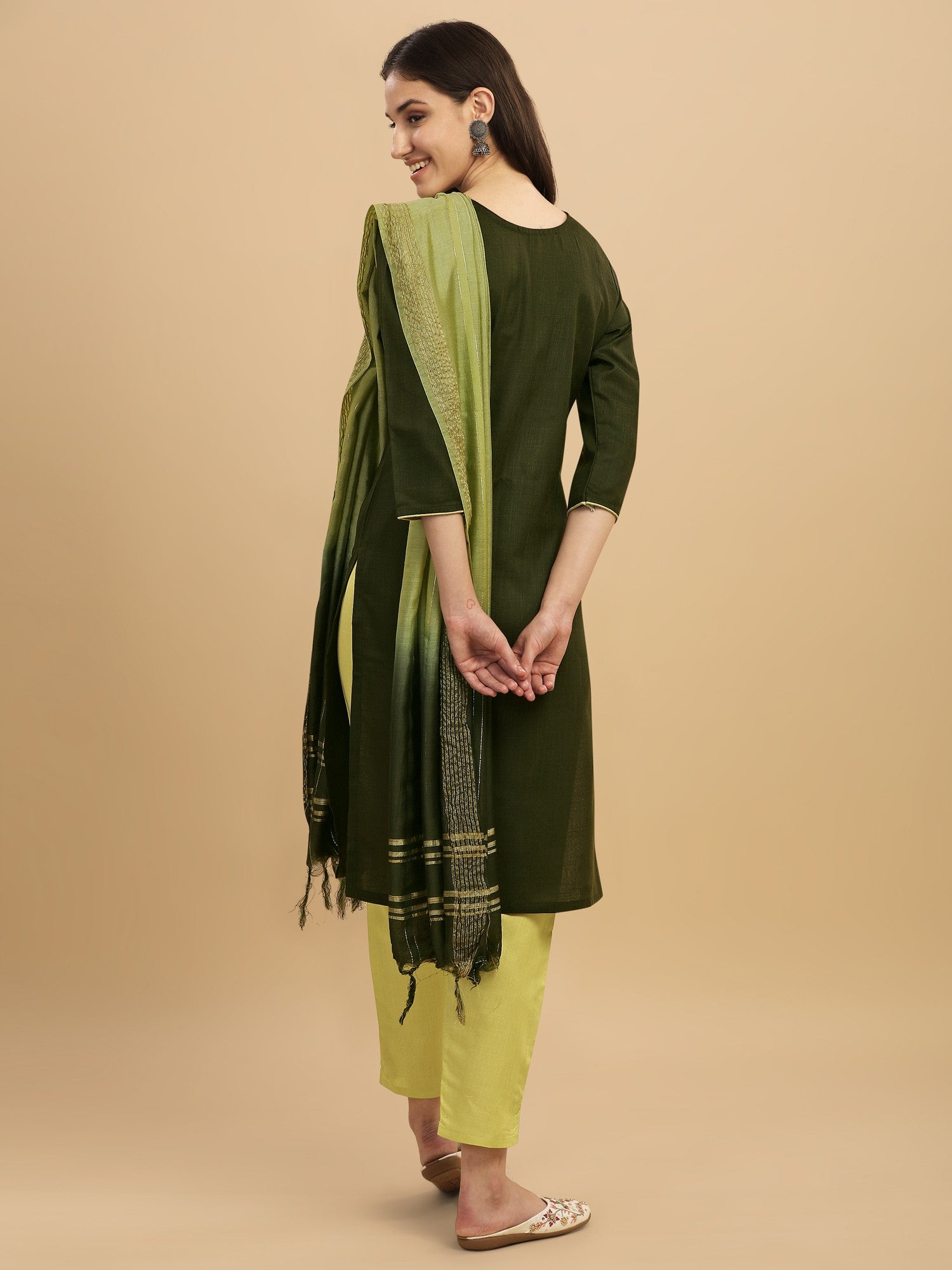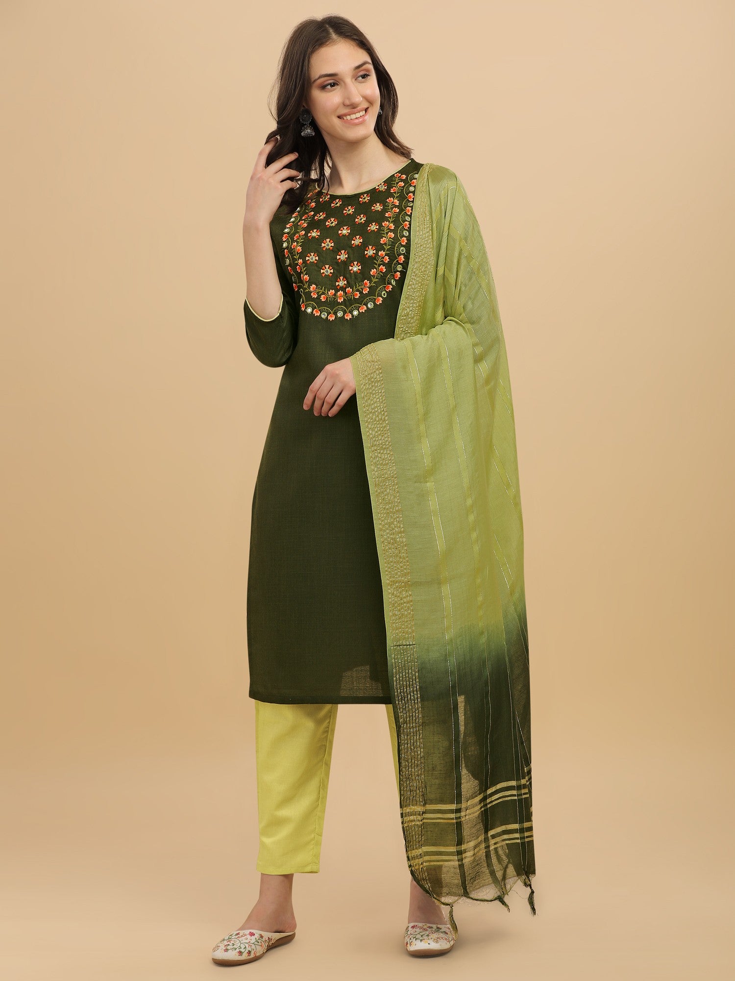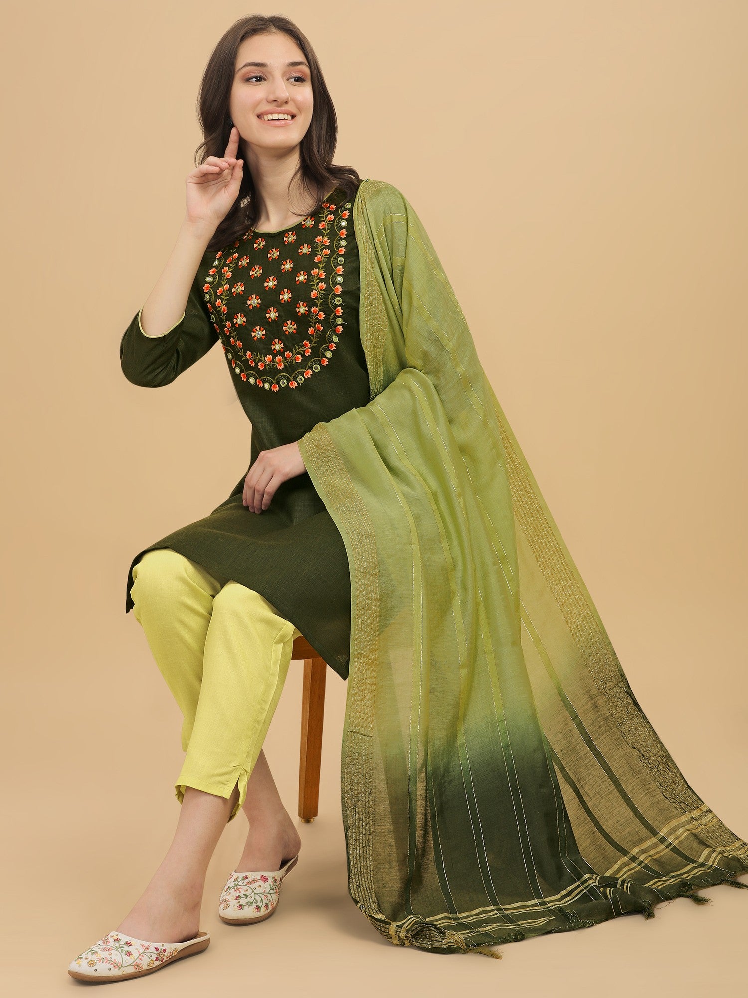 Green Colour Slub Cotton Embroidery Casual Wear Kurta Pant Dupatta Set For Women's