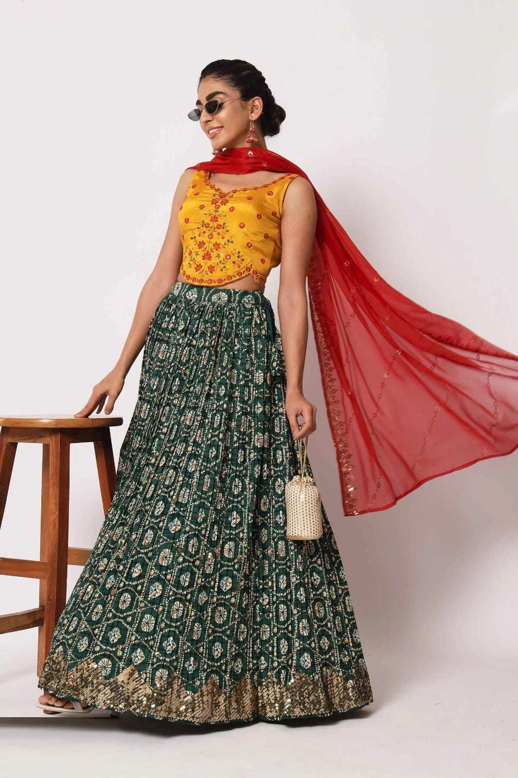 Green Floral Printed Art Silk Lehenga Choli