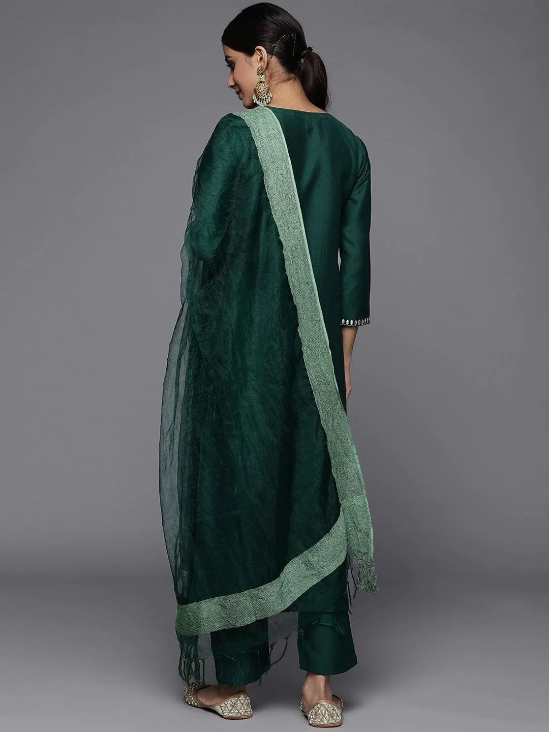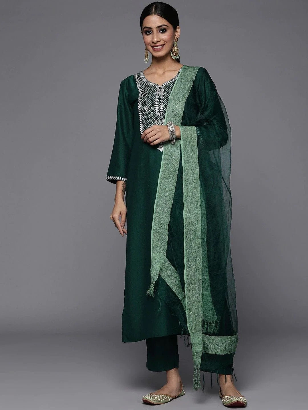 Green Party Wear Embroidery Worked Kurta With Pant And Duppata Set