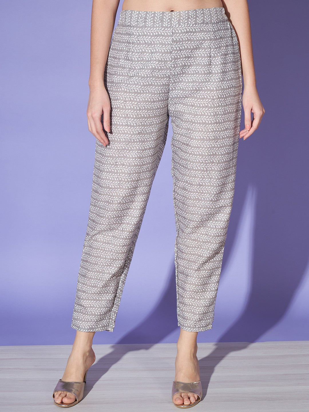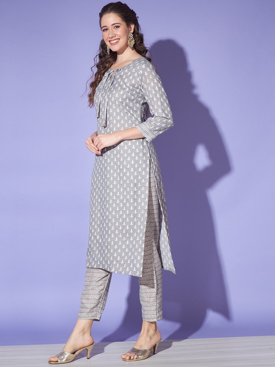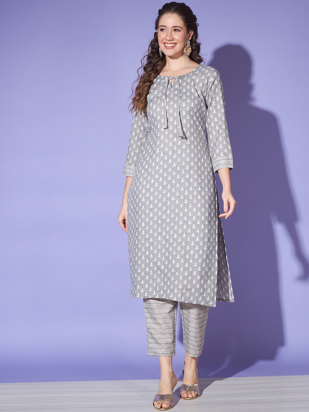 Grey Colour Cotton Jaipuri Printed Casual Wear Kurta Pant Set For Women's