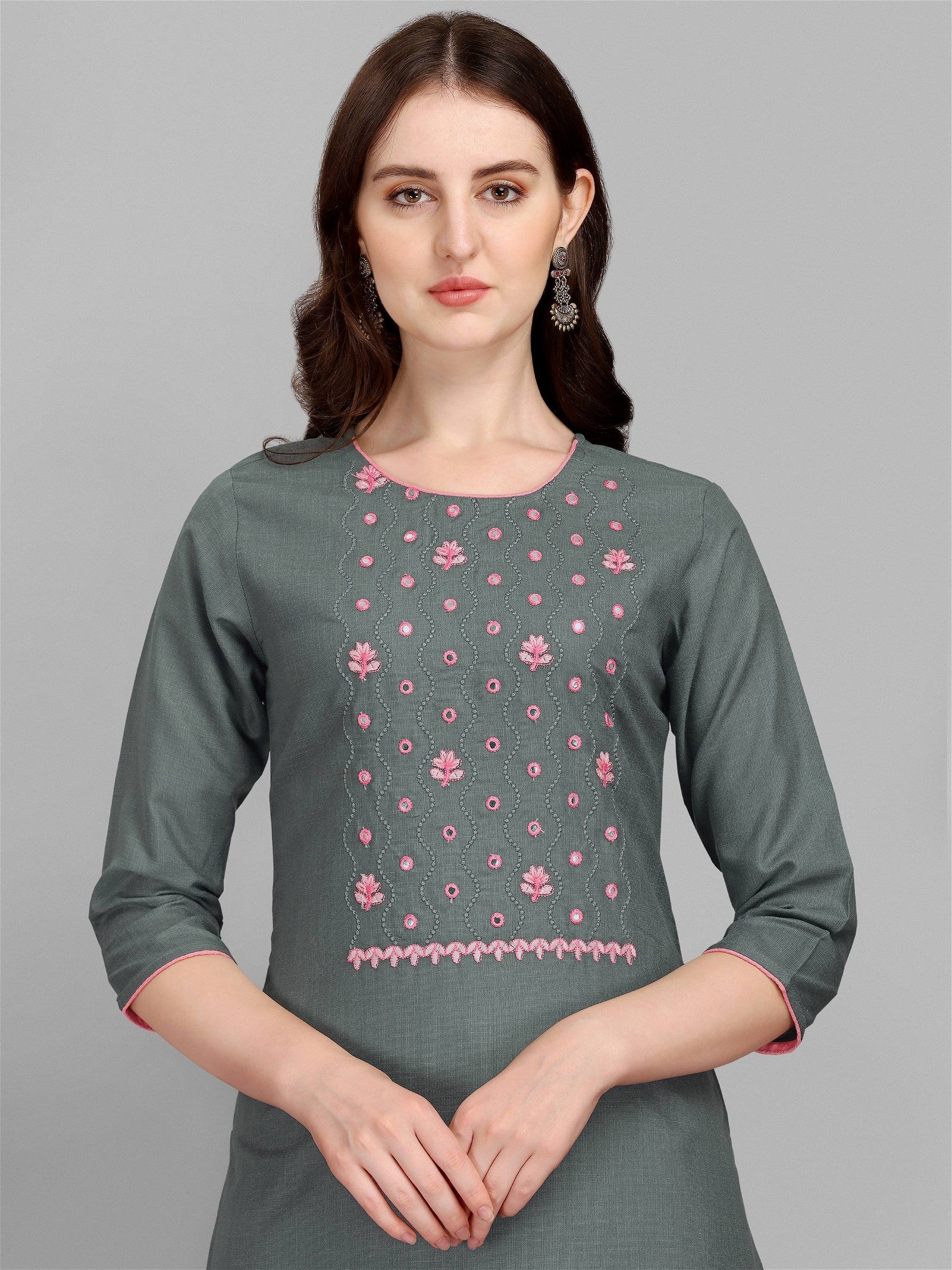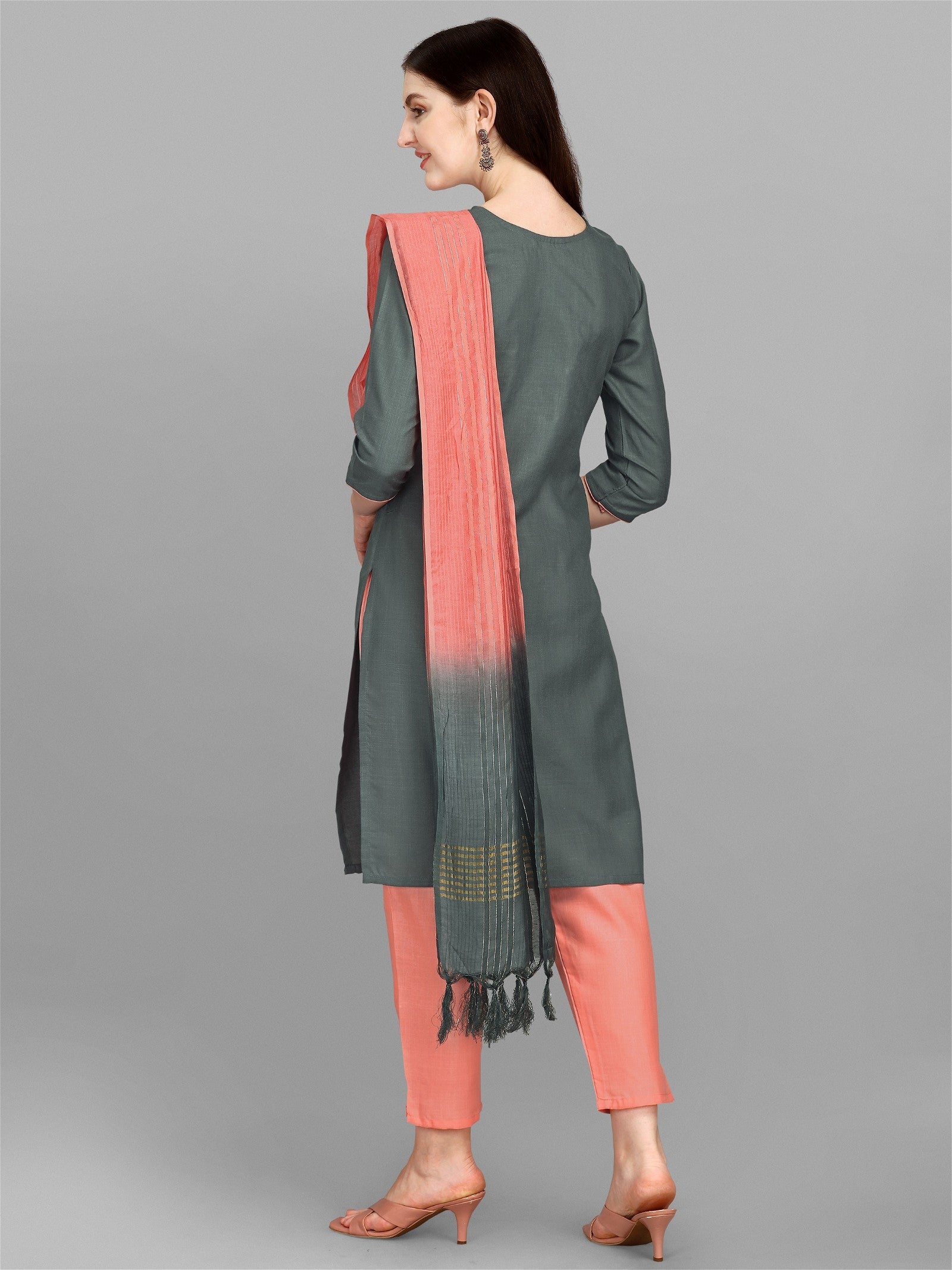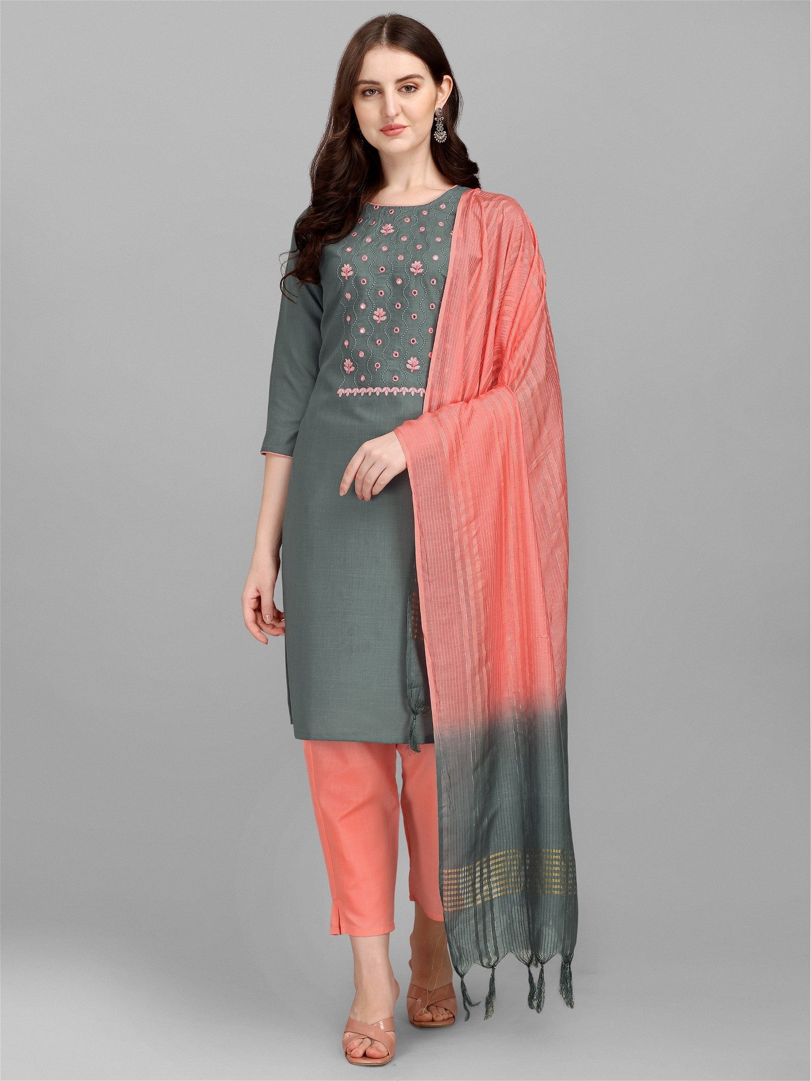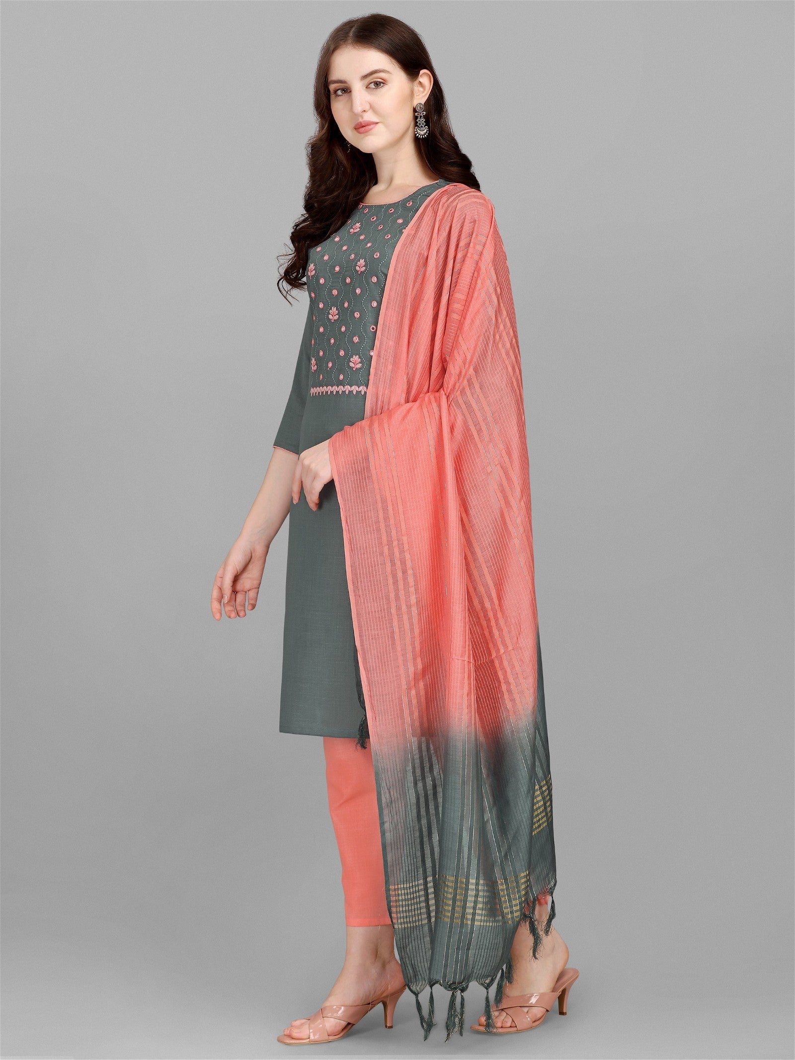 Grey Colour Slub Cotton Embroidery Work Casual Wear Kurta Pant Dupatta Set For Women's
