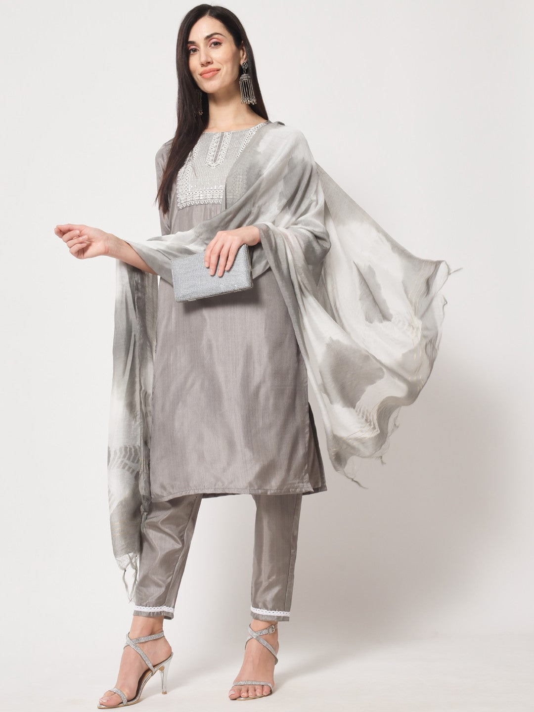 Grey Colour South Silk Embroidery Work Casual Wear Kurta Pant Dupatta Set For Women's