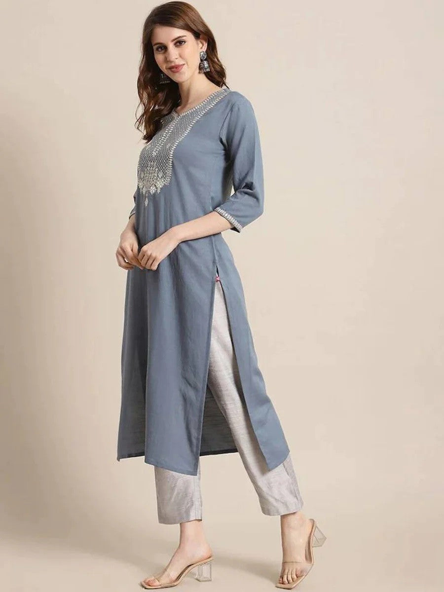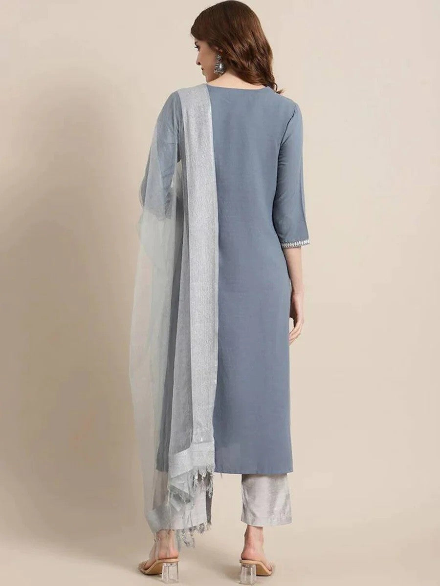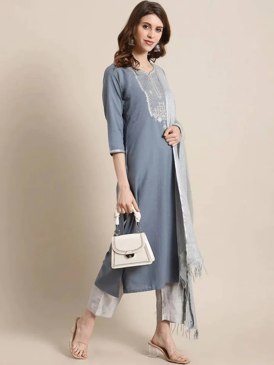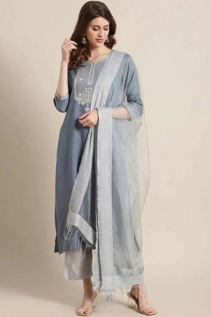 Grey Party Wear Embroidery Worked Kurta With Pant And Duppata Set