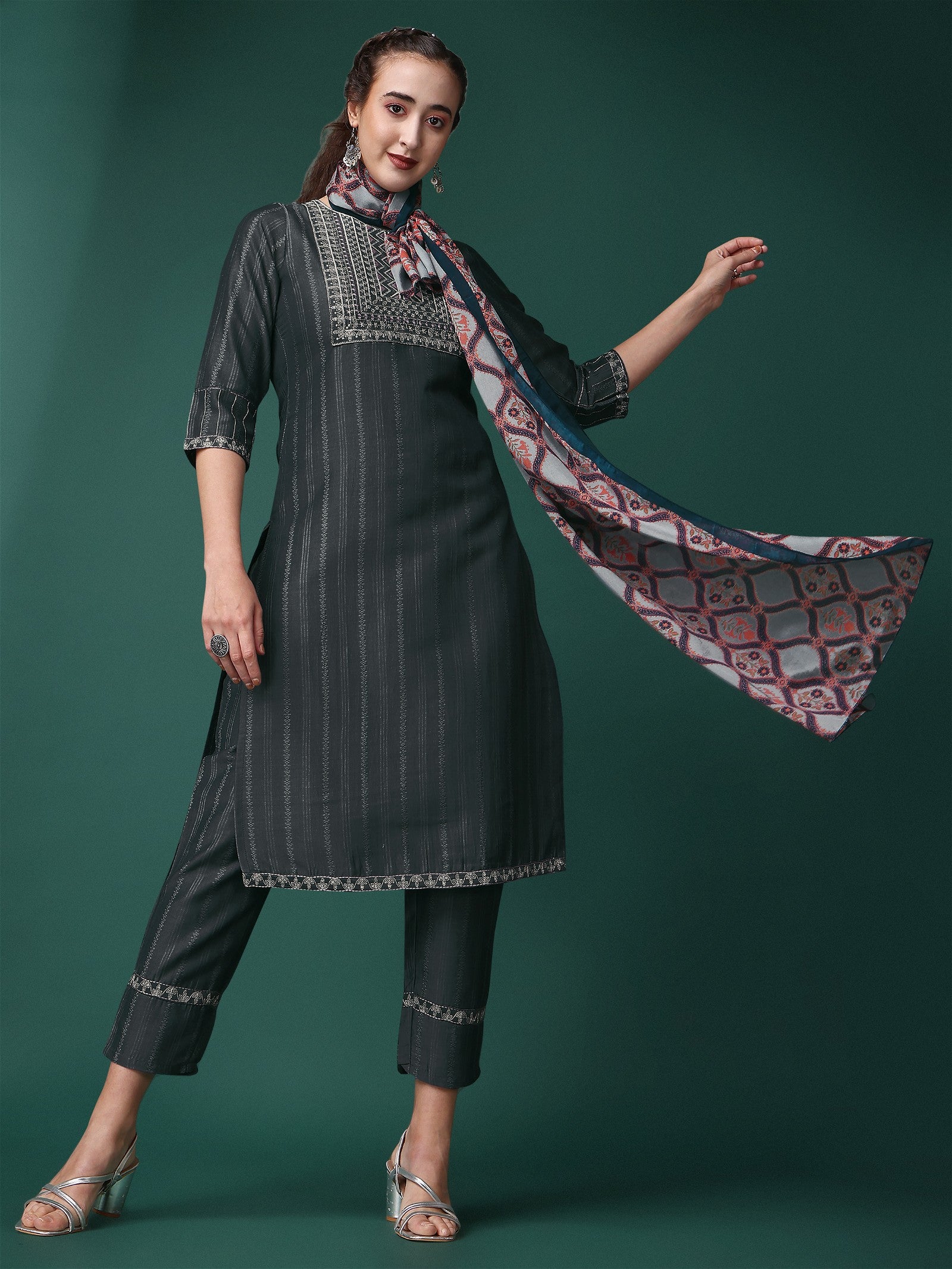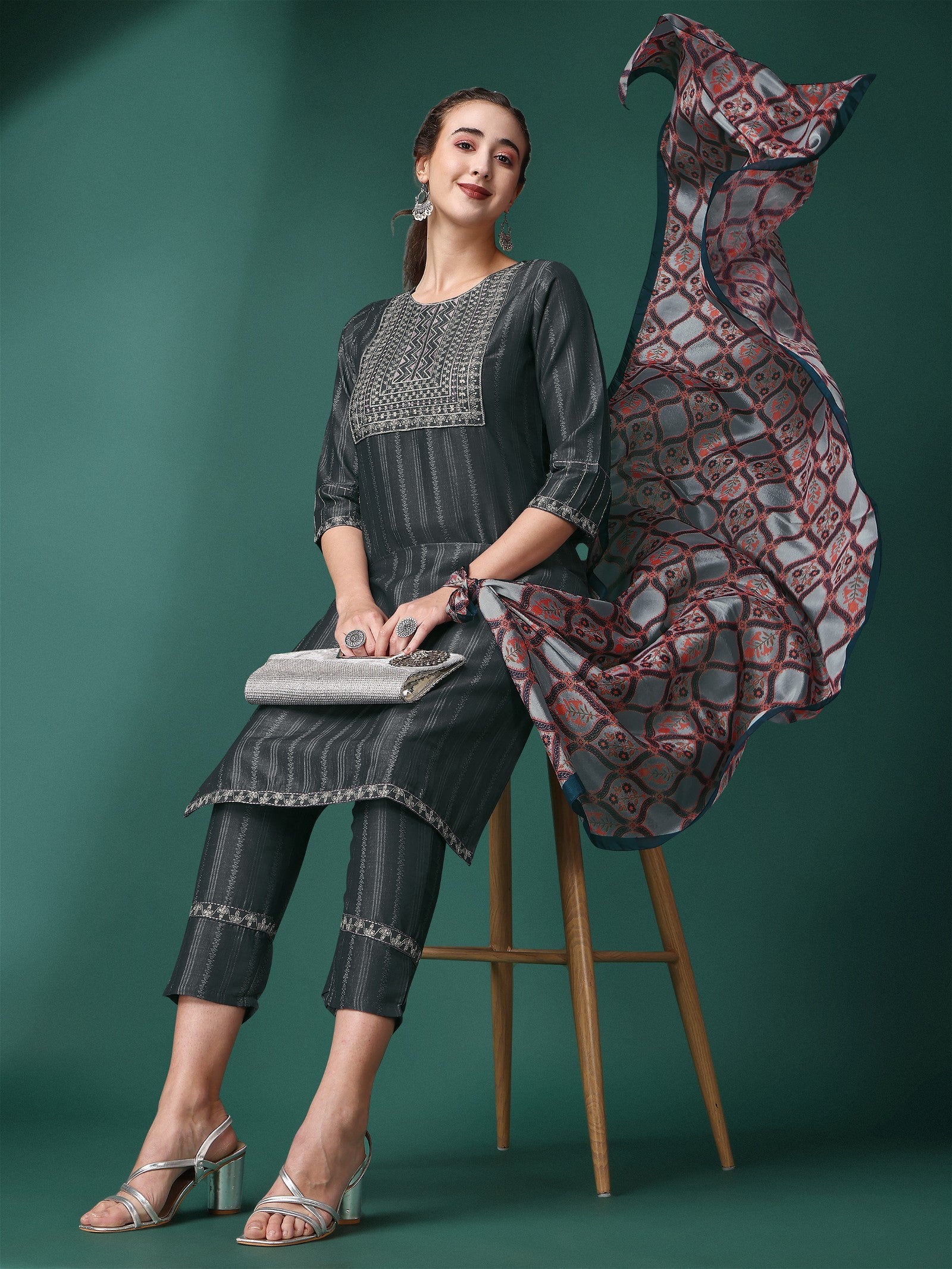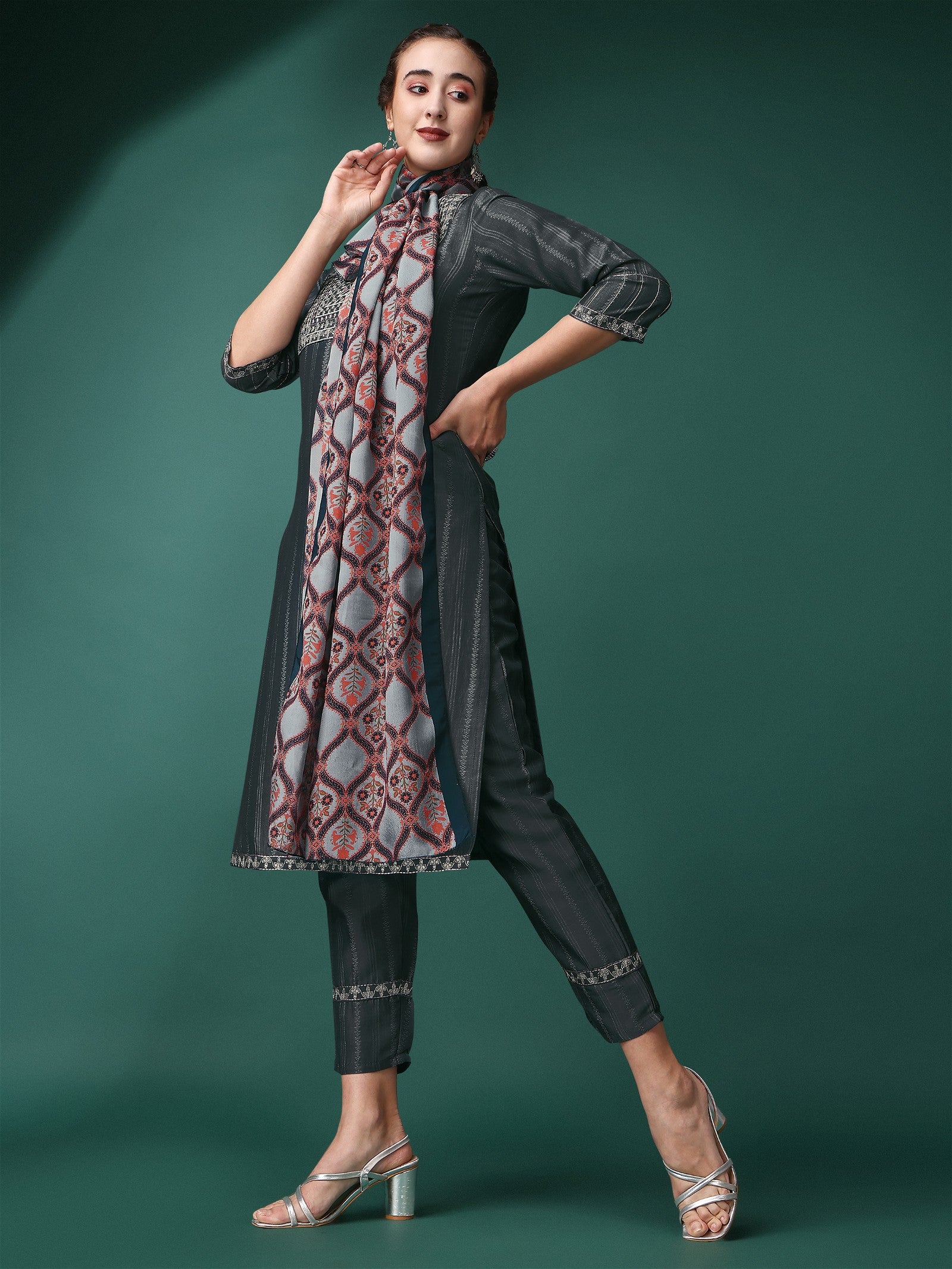 Grey Party Wear Embroidery Worked Kurta With Pant And Duppata Set