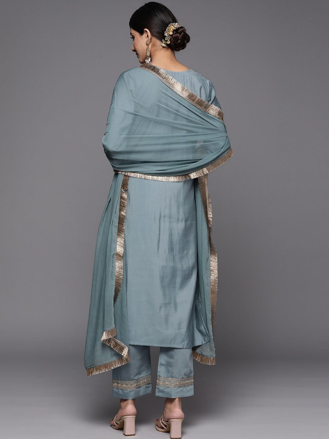 Grey Viscose Chanderi Party Wear Embroidery Worked Kurta With Pant And Duppata Set