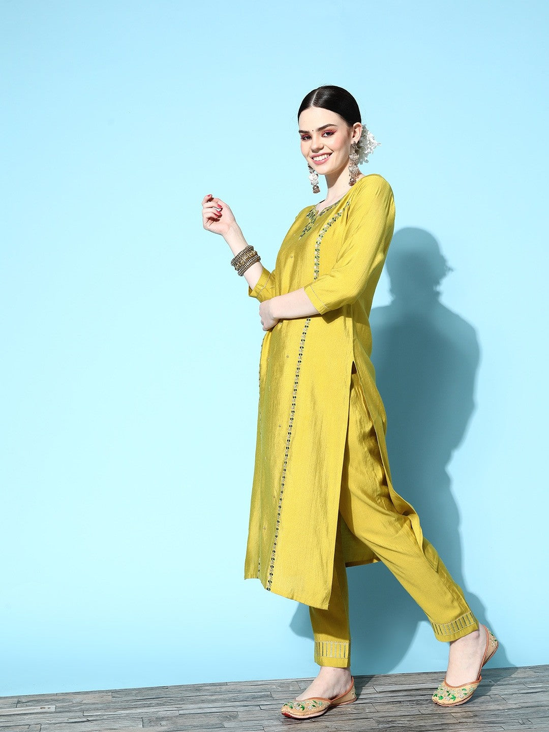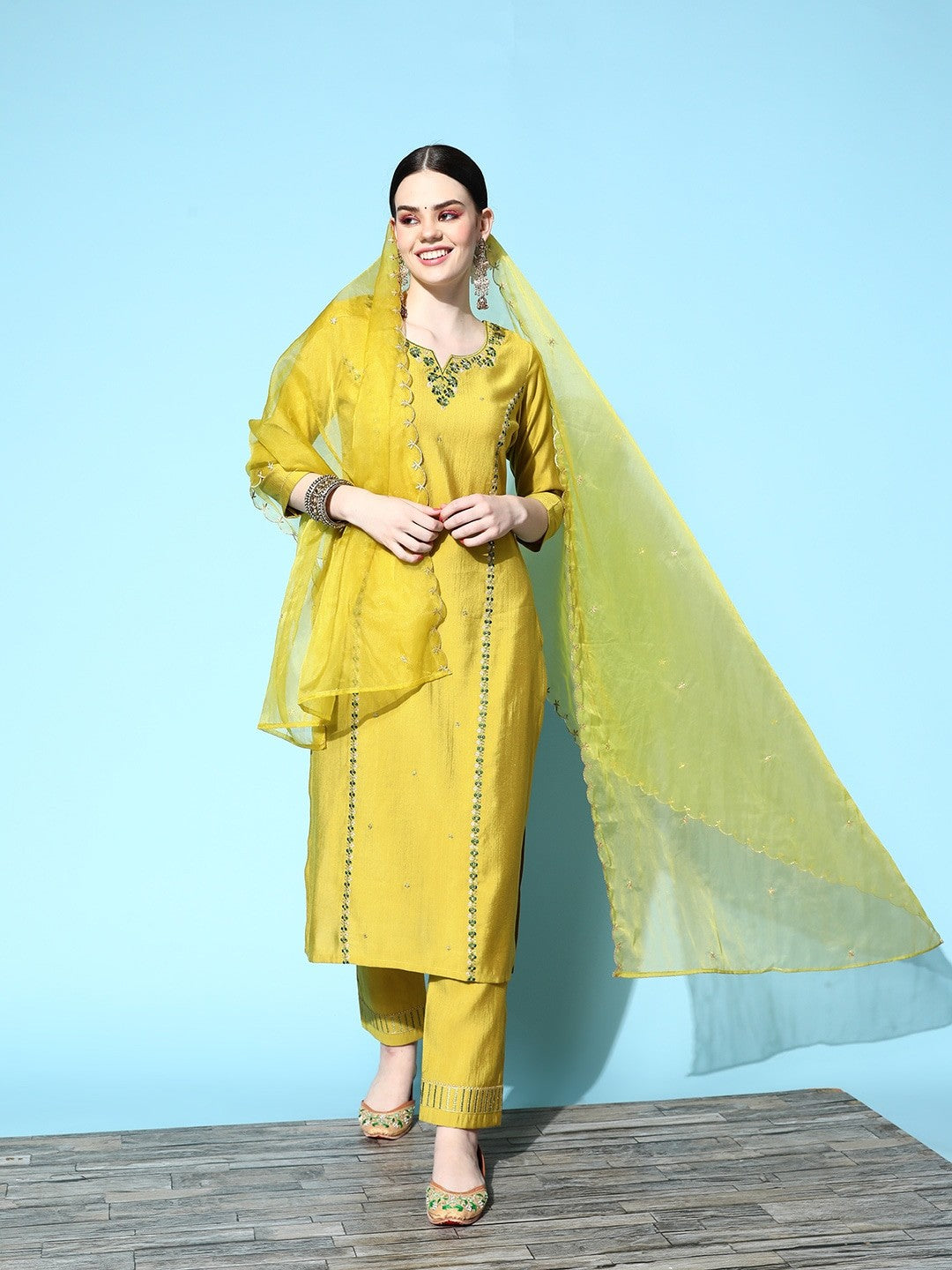 Lemon Party Wear Embroidery Worked Kurta With Pant And Duppata Set