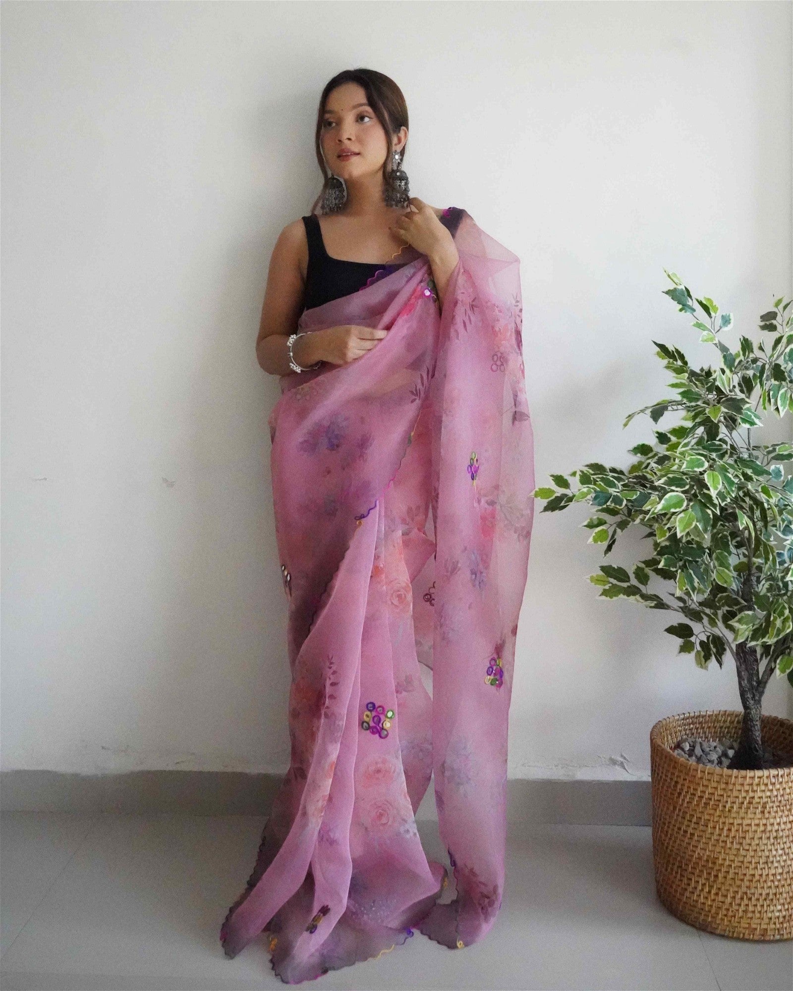 Light Pink Colour Organza Digital Print With Gota Patti Work Saree For Women's