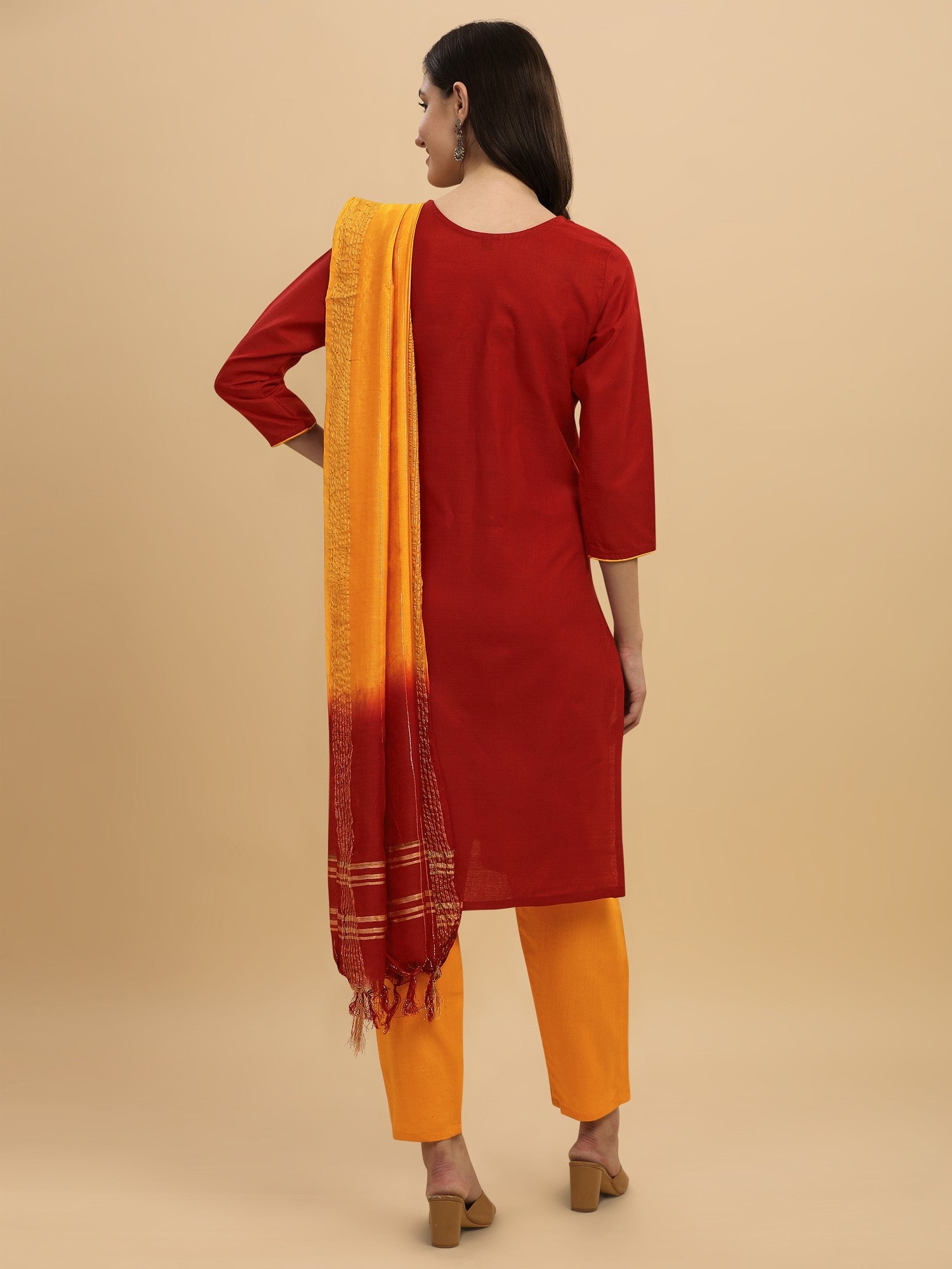 Maroon Colour Slub Cotton Embroidery Casual Wear Kurta Pant Dupatta Set For Women's
