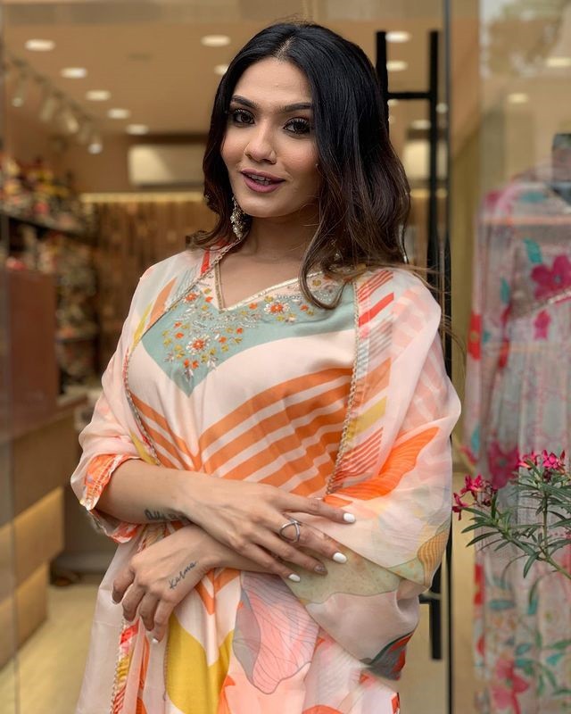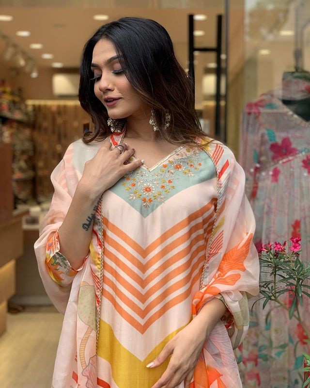 Multicolor Maslin Straight Kurti With Pant And Oraganza Dupatta