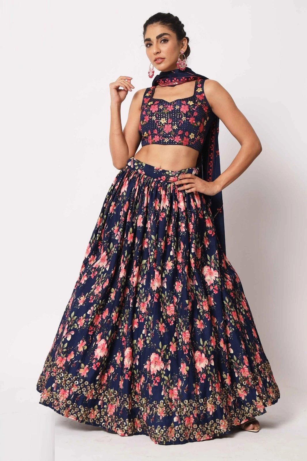 Navy Blue Floral Printed Art Silk Lehenga Choli