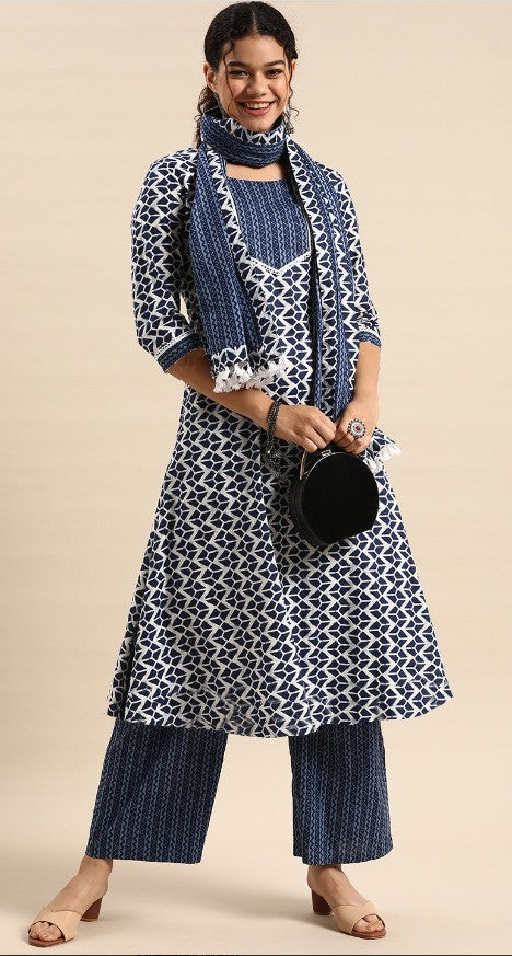 Neavy Blue & White Printed Fancy Kurti With Bottom & White Dupatta set