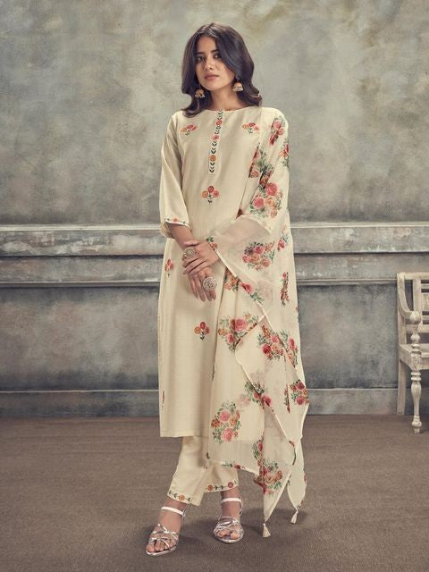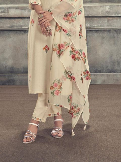 Off White Party Wear Embroidery Worked Kurta With Pant And Duppata Set