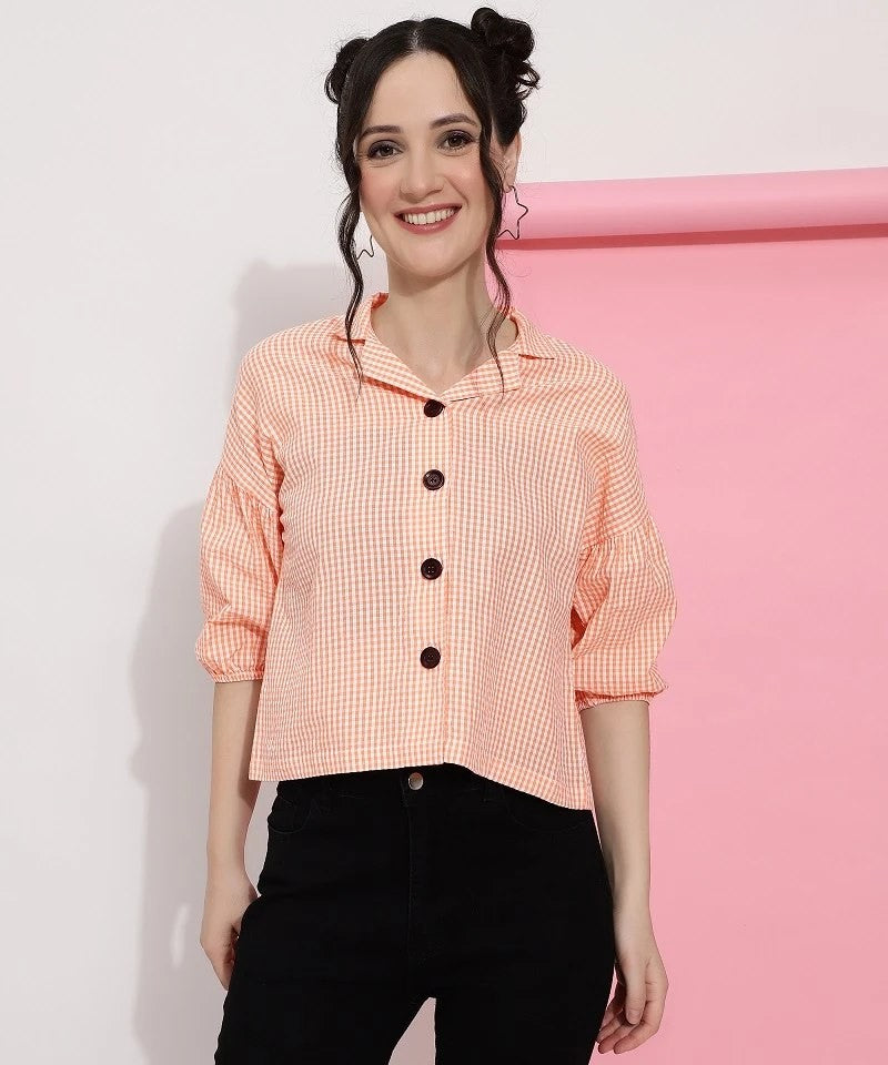 Peach Colour Casual Wear Check Printed Shirt For Women