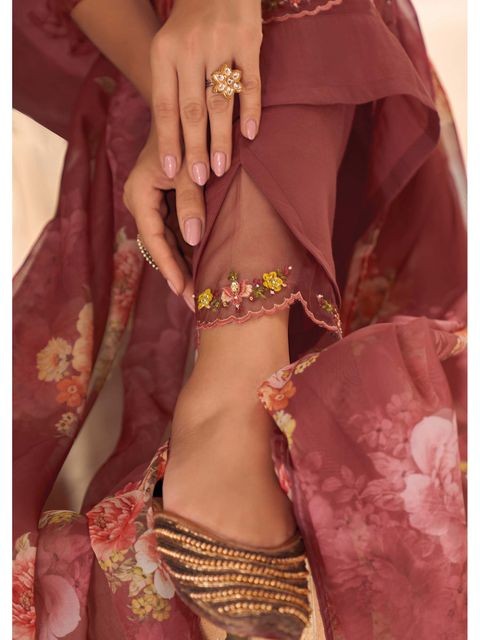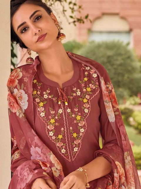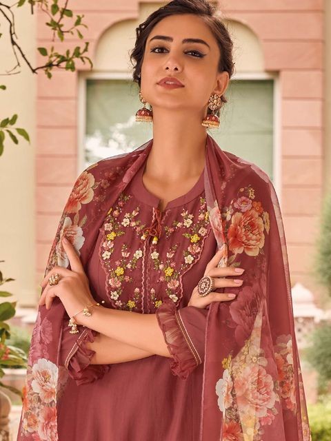 Peach Party Wear Embroidery Worked Kurta With Pant And Duppata Set