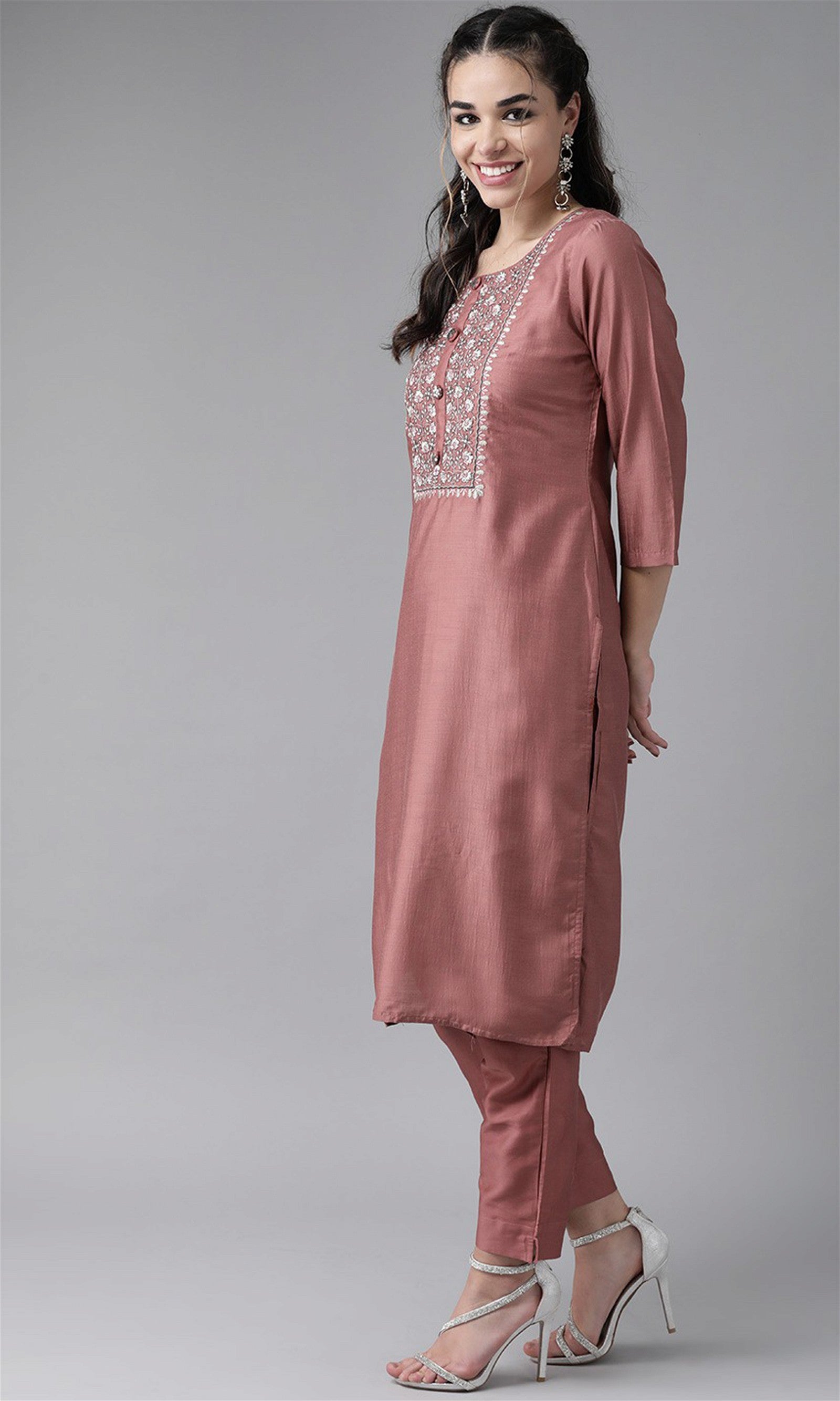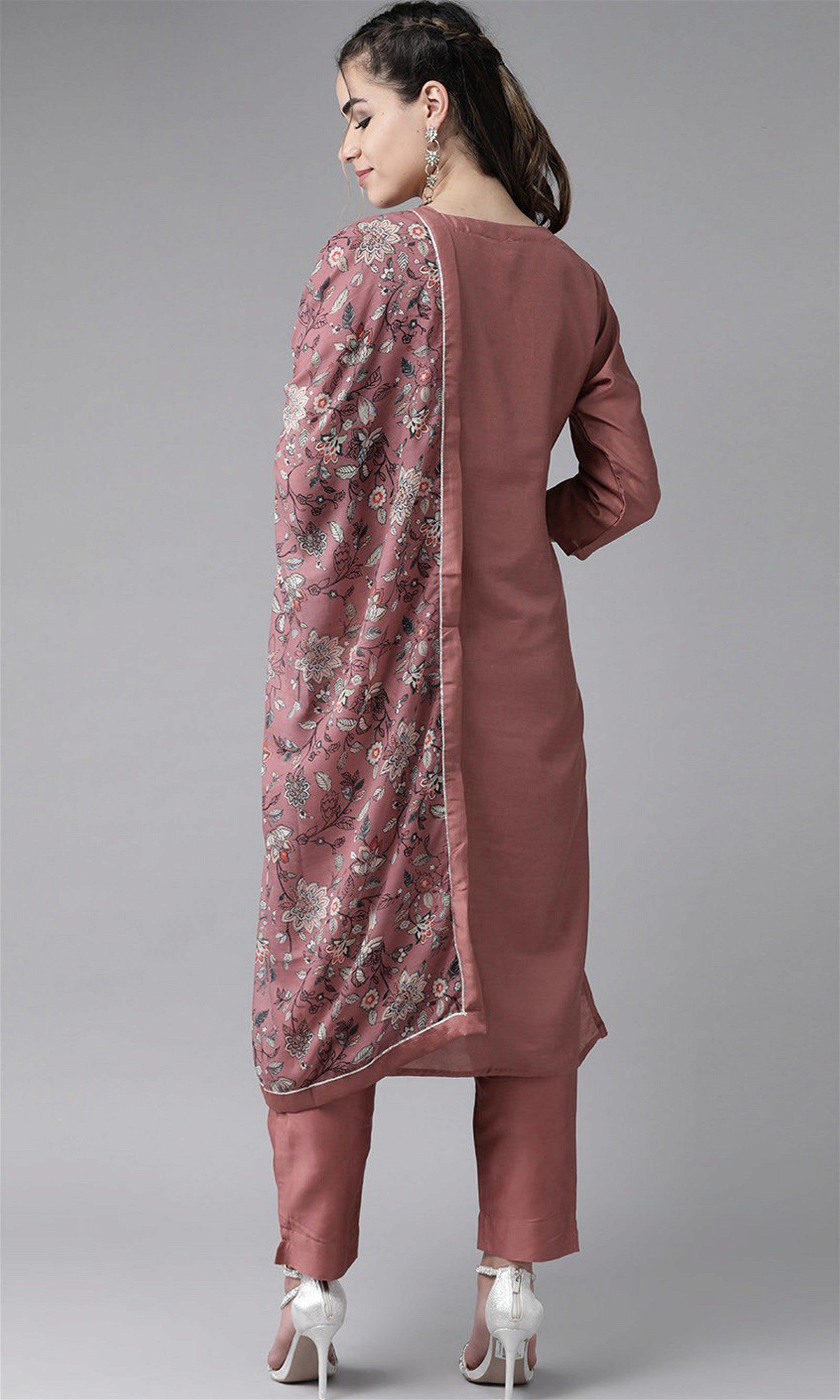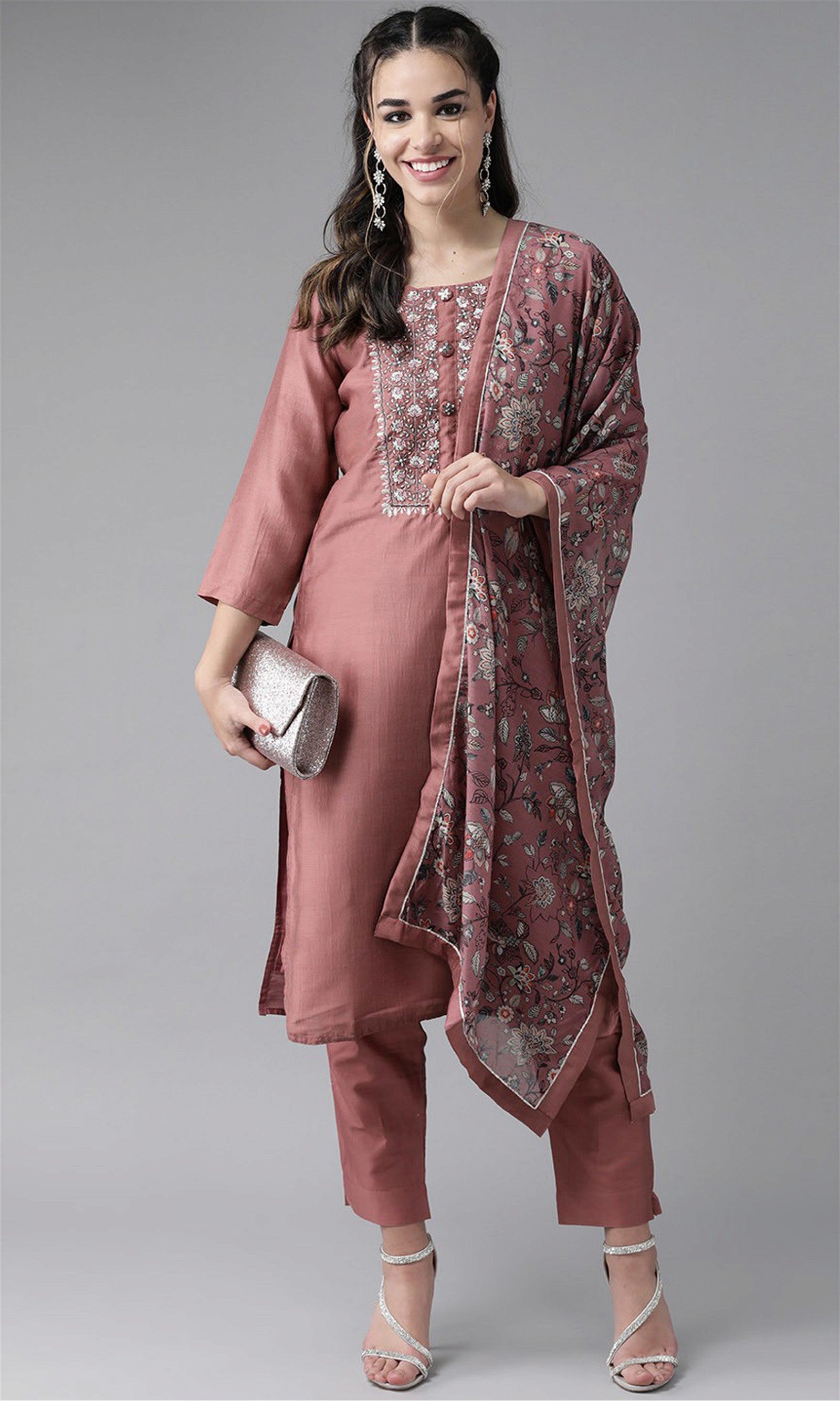 Peach Party Wear Embroidery Worked Kurta With Pant And Duppata Set