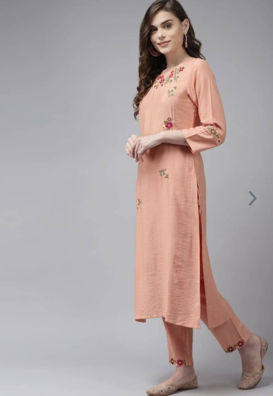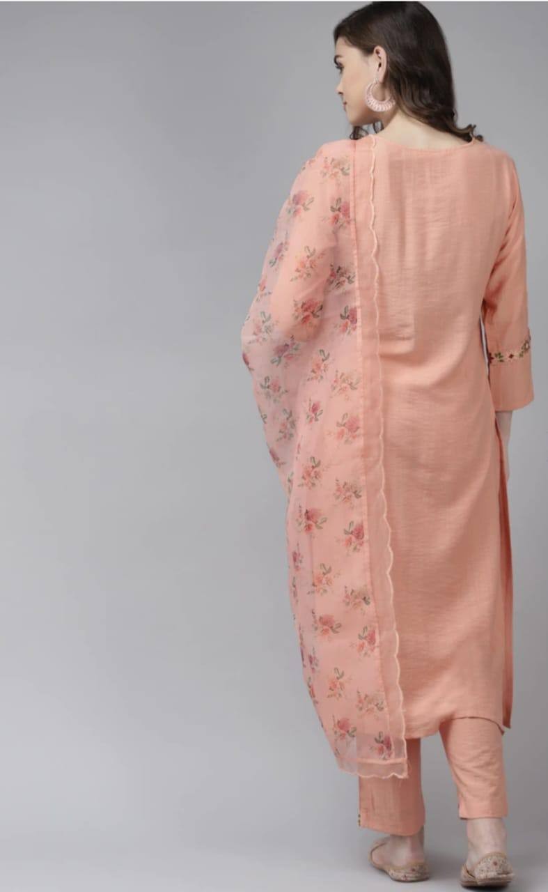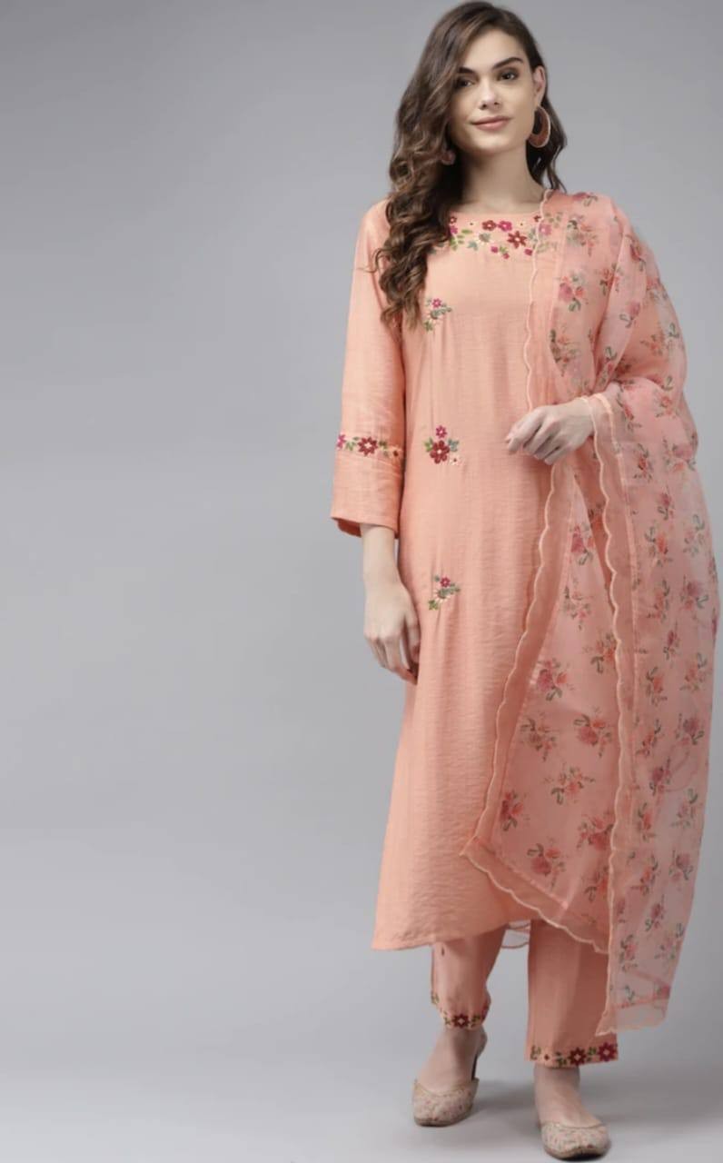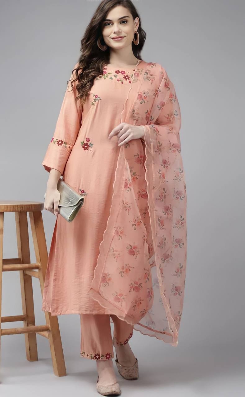 Peach Party Wear Embroidery Worked Kurta With Pant And Duppata Set