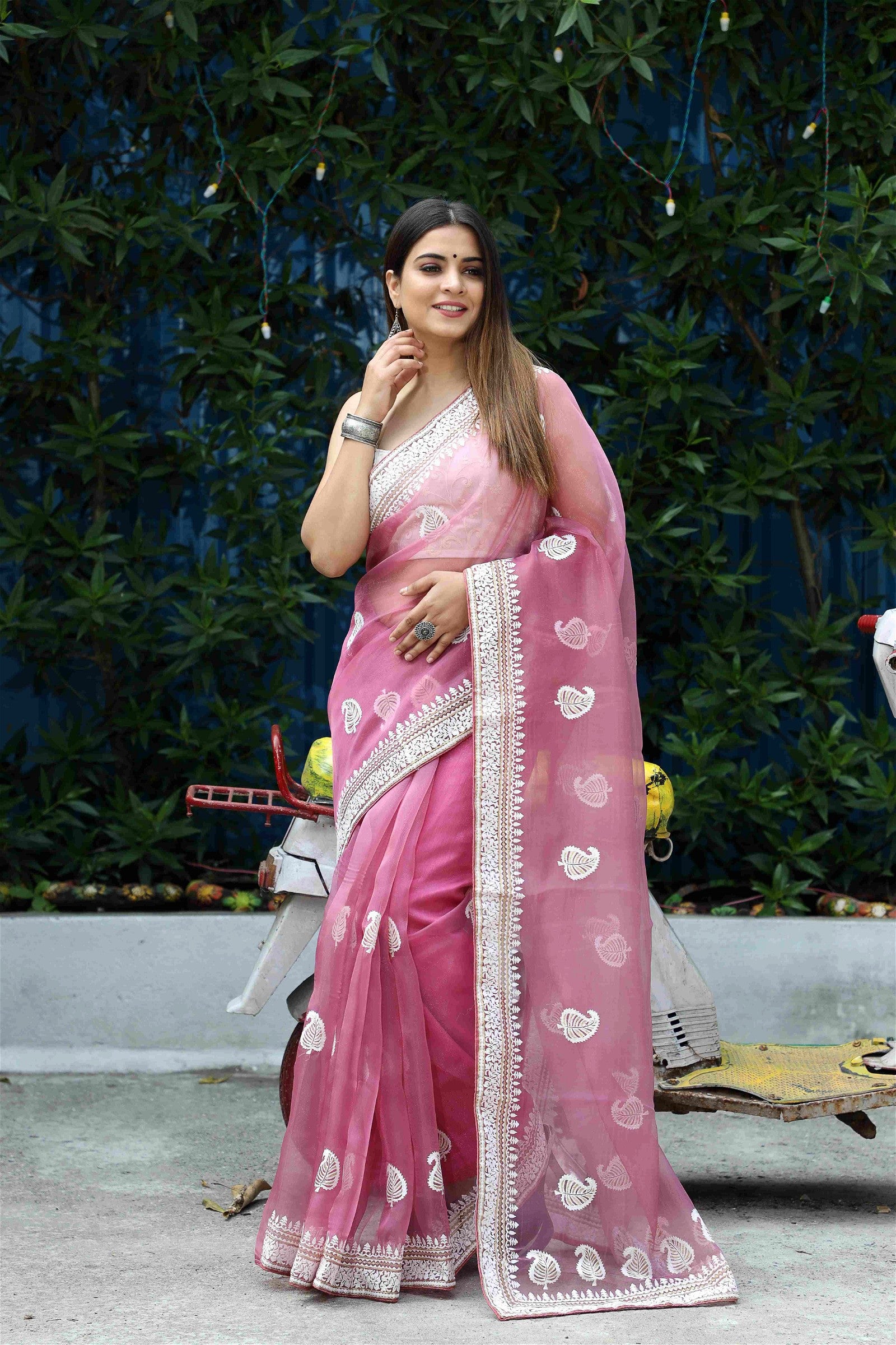 Pink Colour Organza Embroidery With Piping Work Saree For Women's