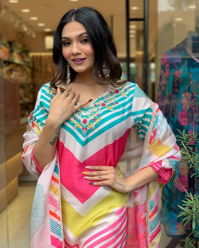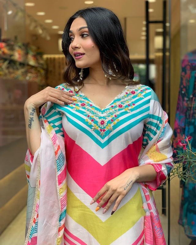 Pink Multicolor Maslin Straight Kurti With Pant And Oraganza Dupatta