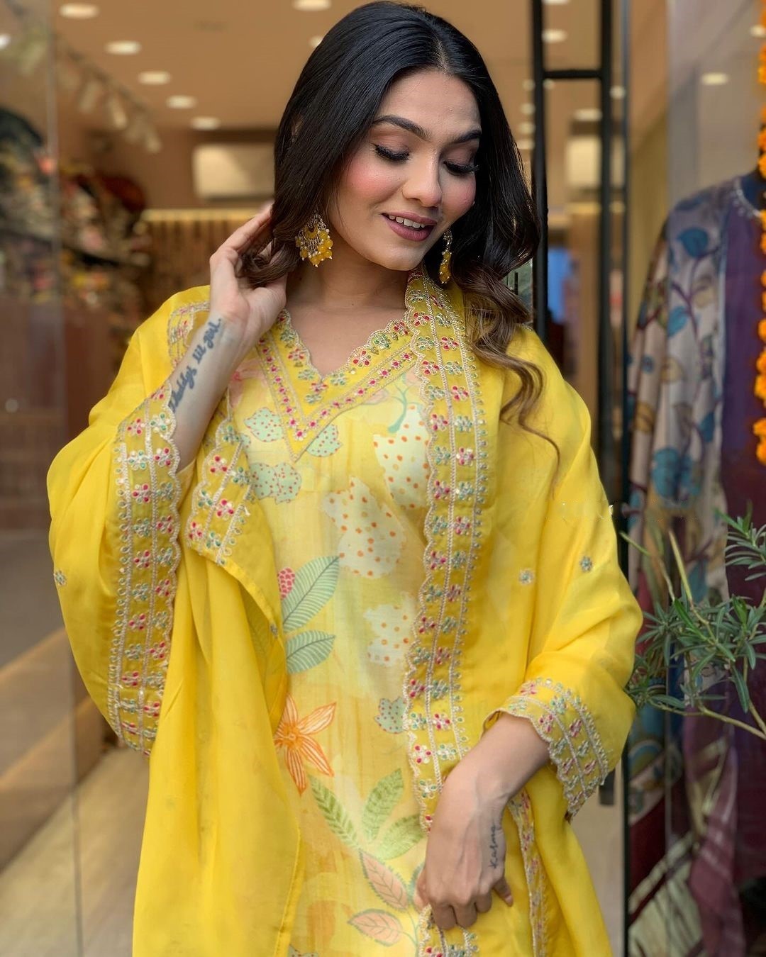 Printed Maslin Kurti With Pant And Organza Dupatta