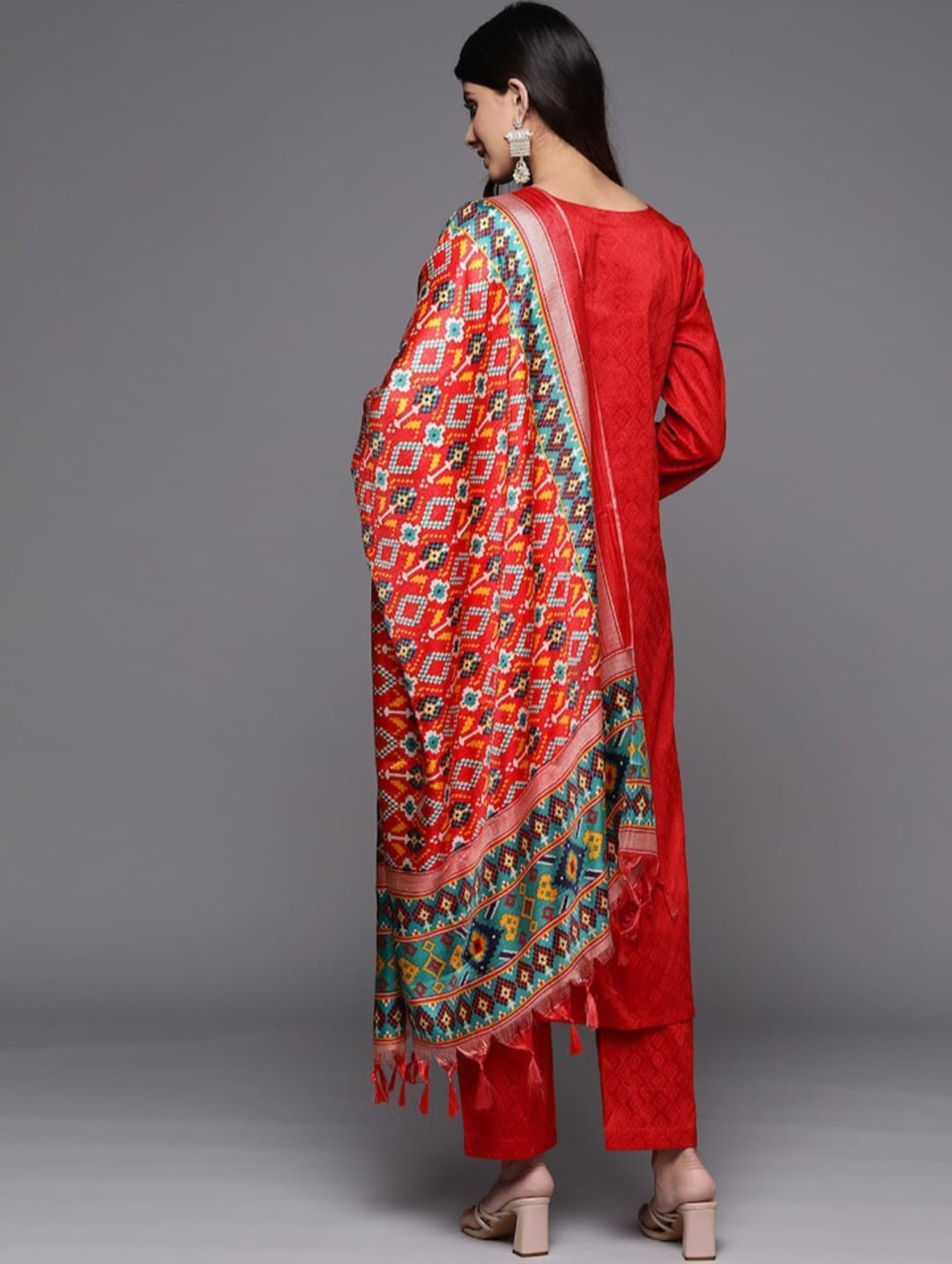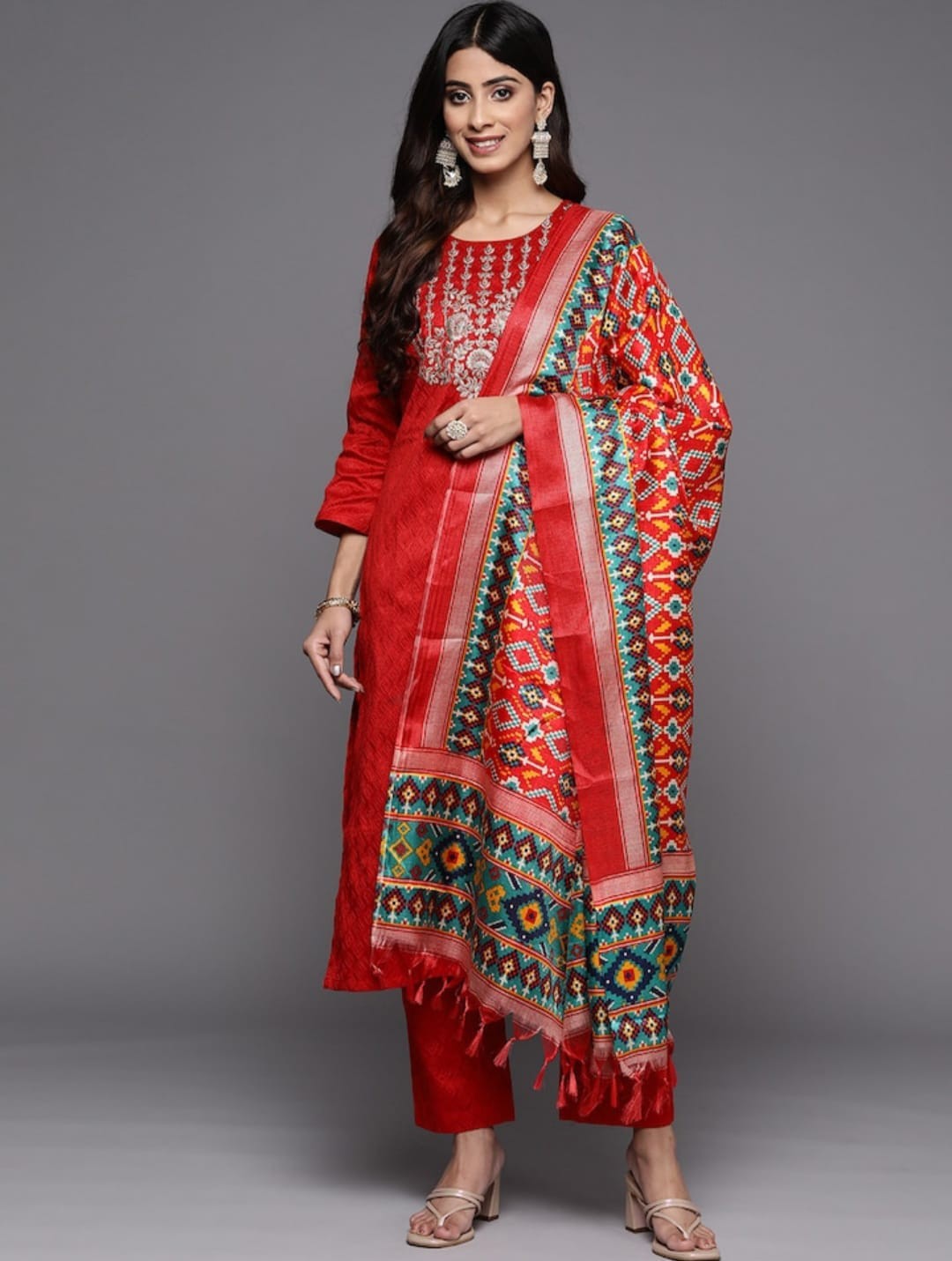 Red Party Wear Embroidery Worked Kurta With Pant And Duppata Set