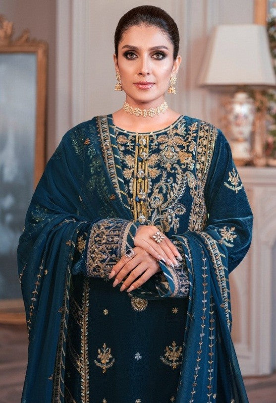 Teal Blue Color Winter Collection Heavy Embroidered Velvet Salwar Suit