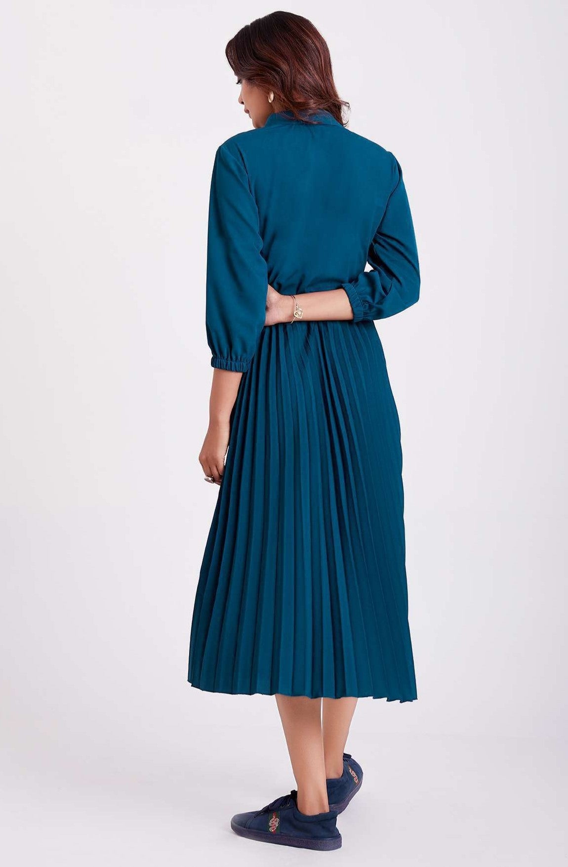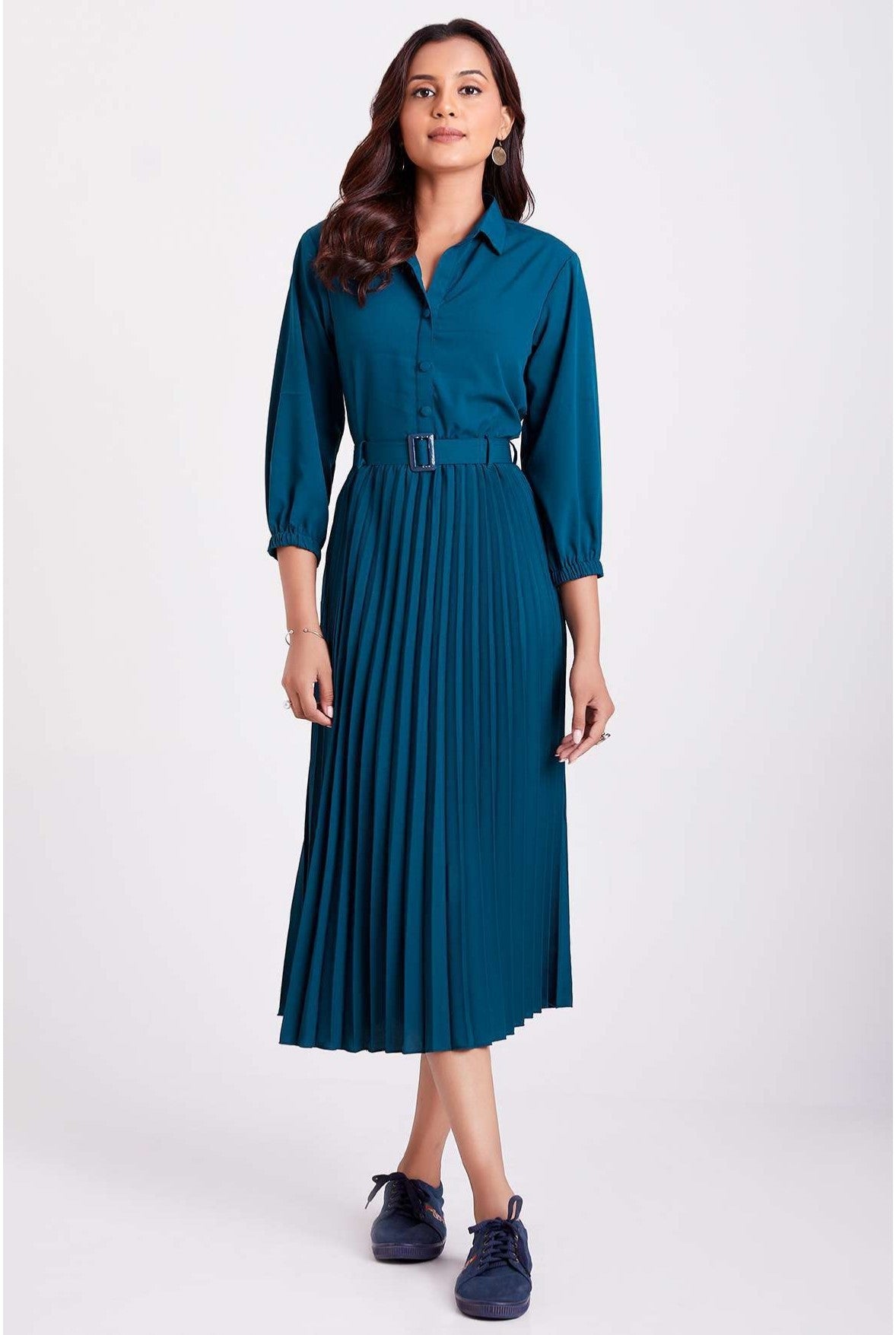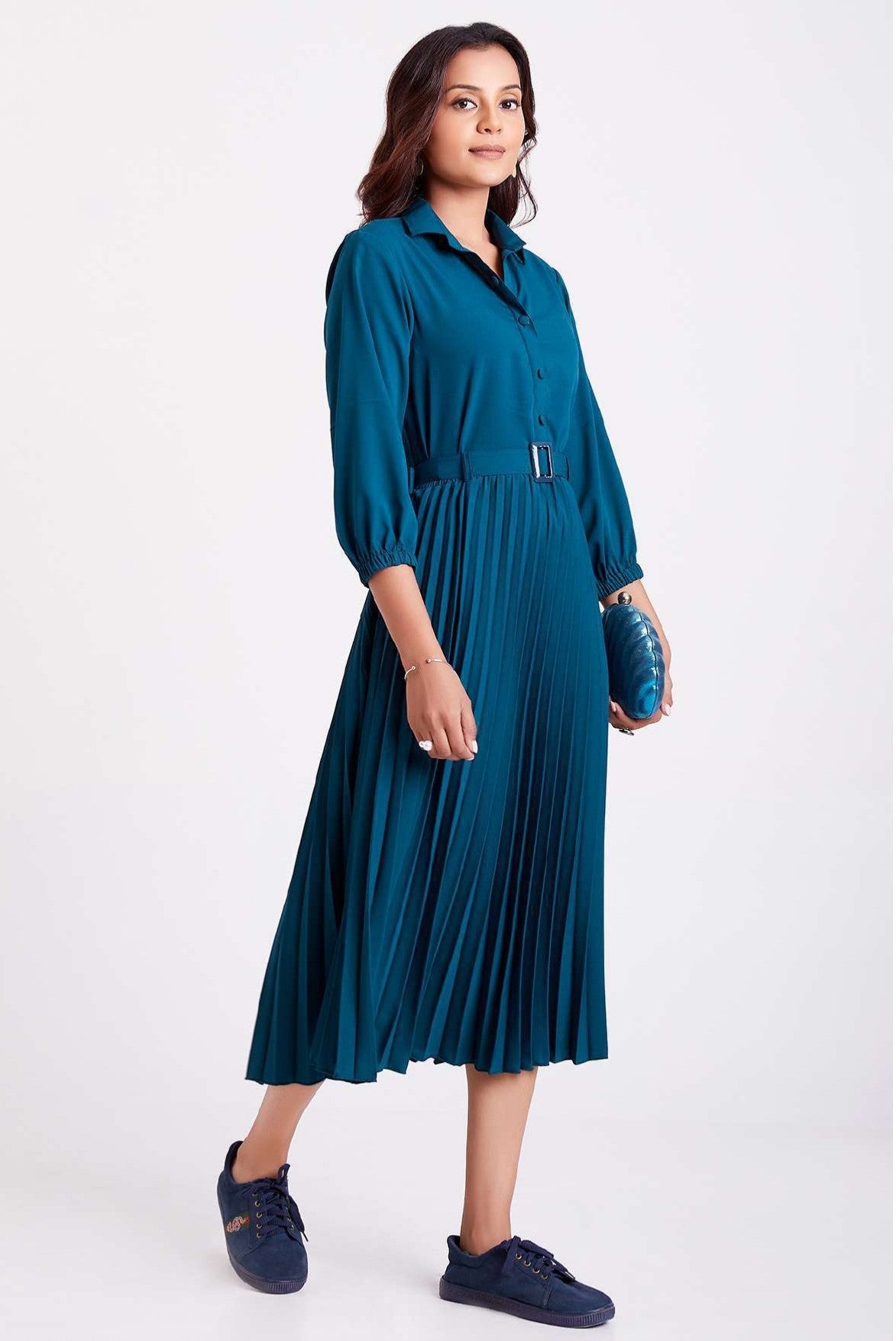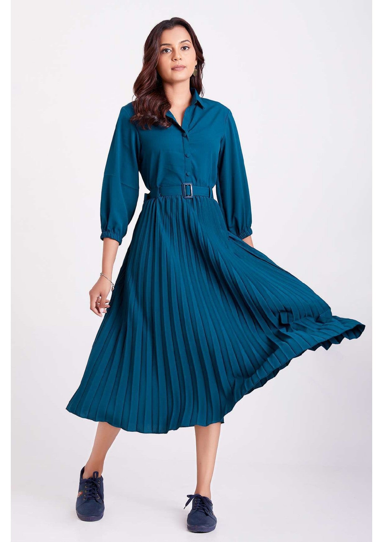 Teal Blue Colour Pleated Western Wear Drees For Women