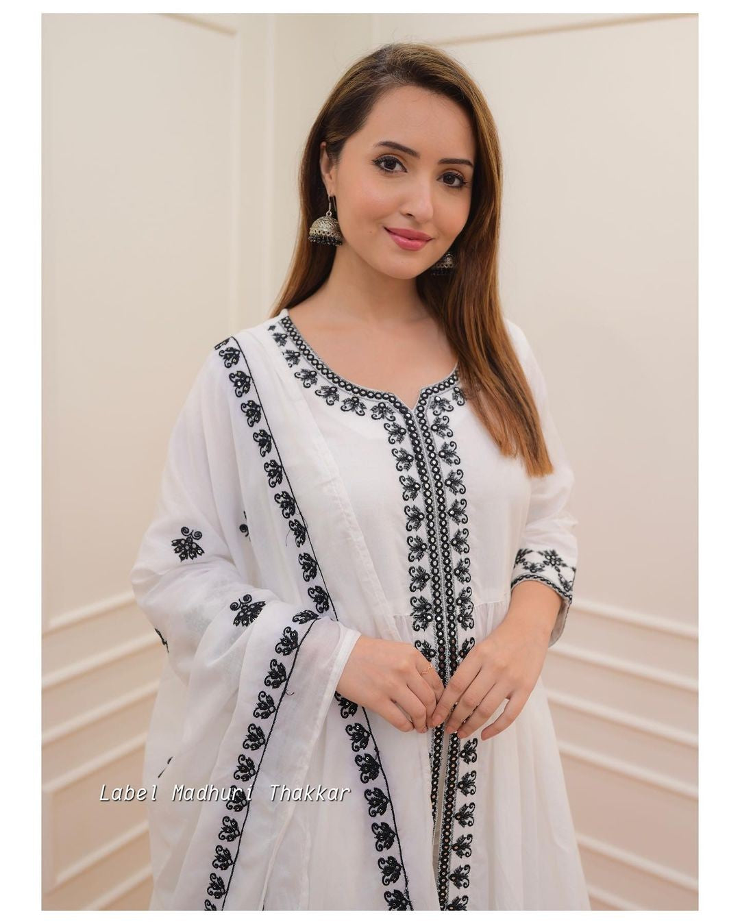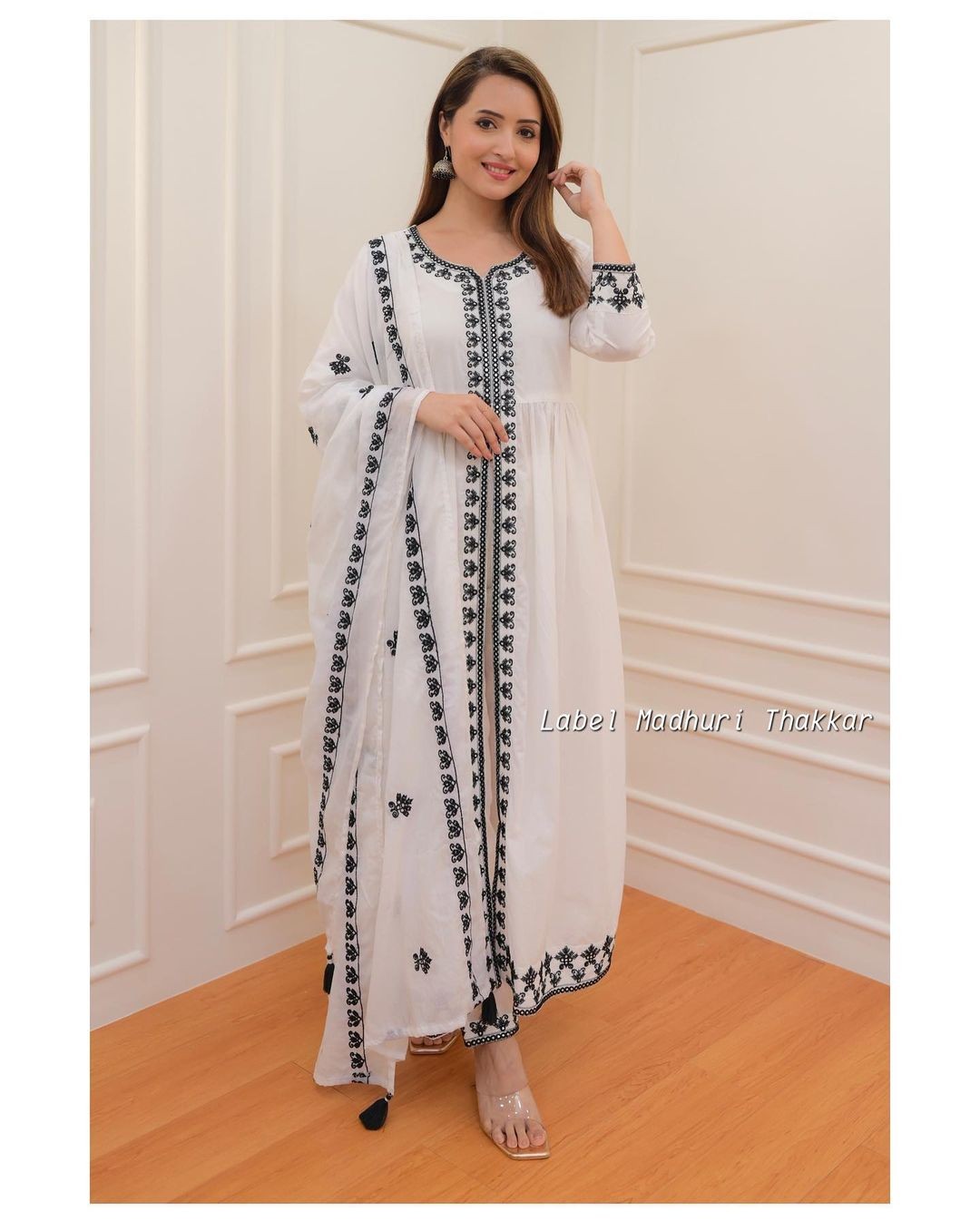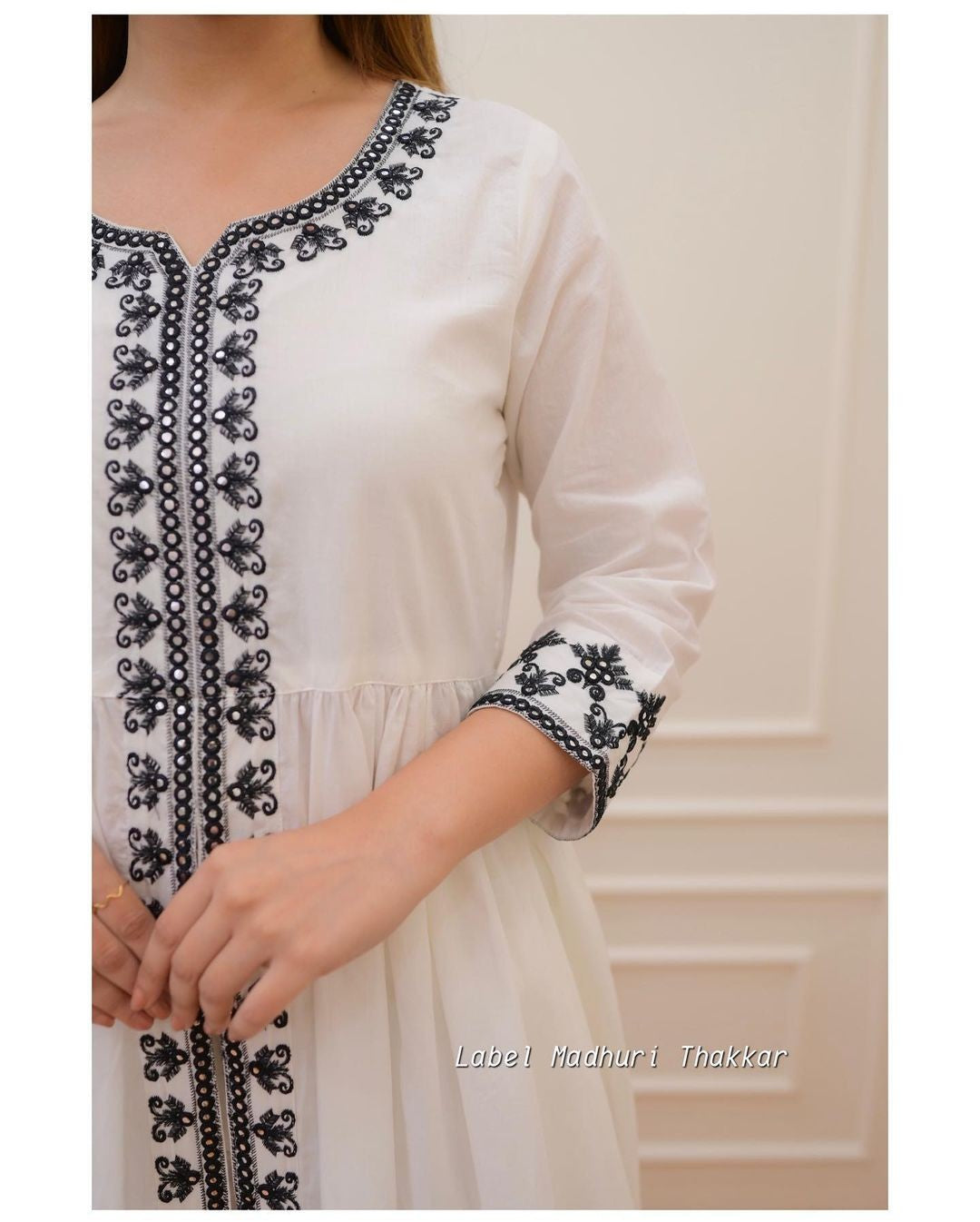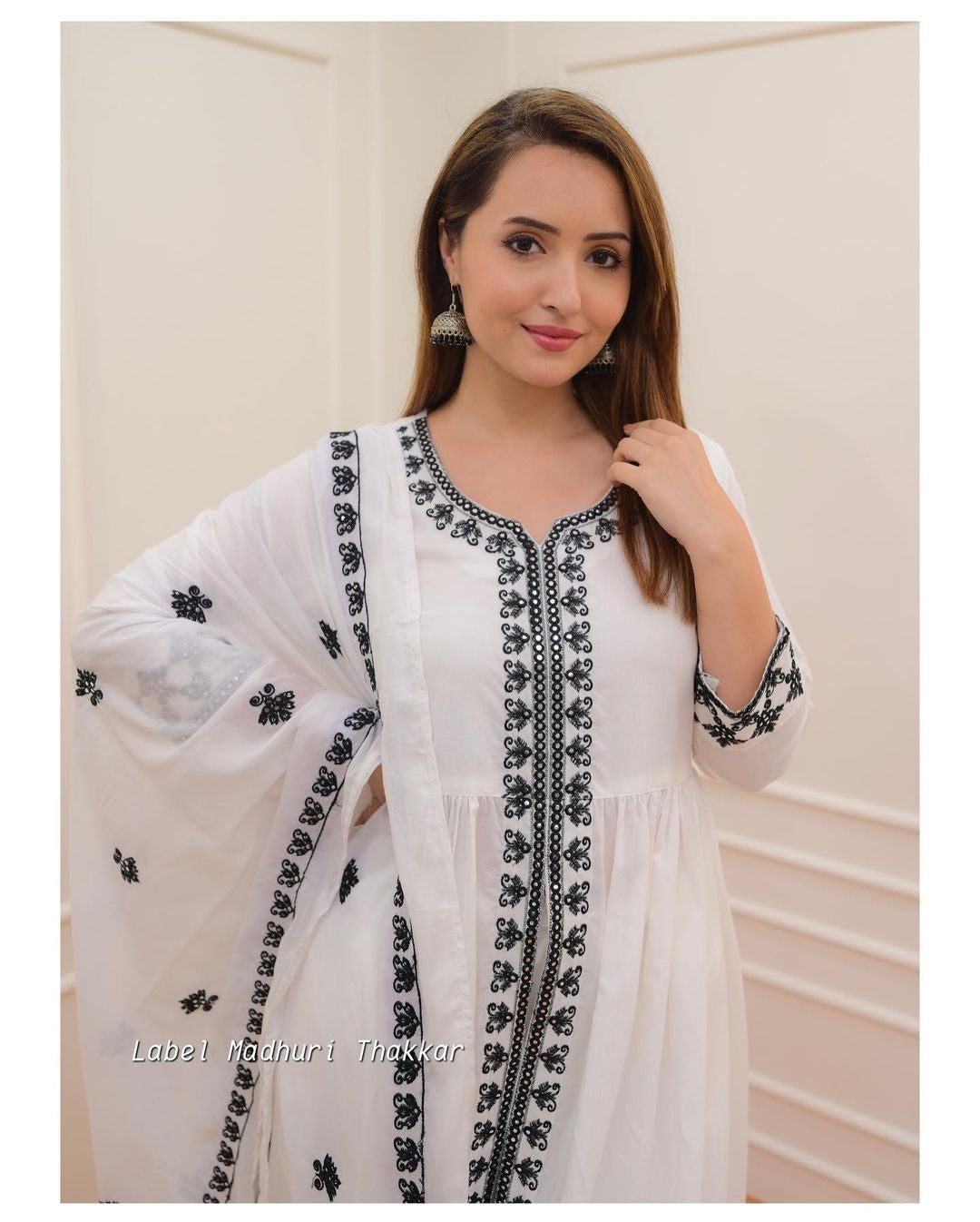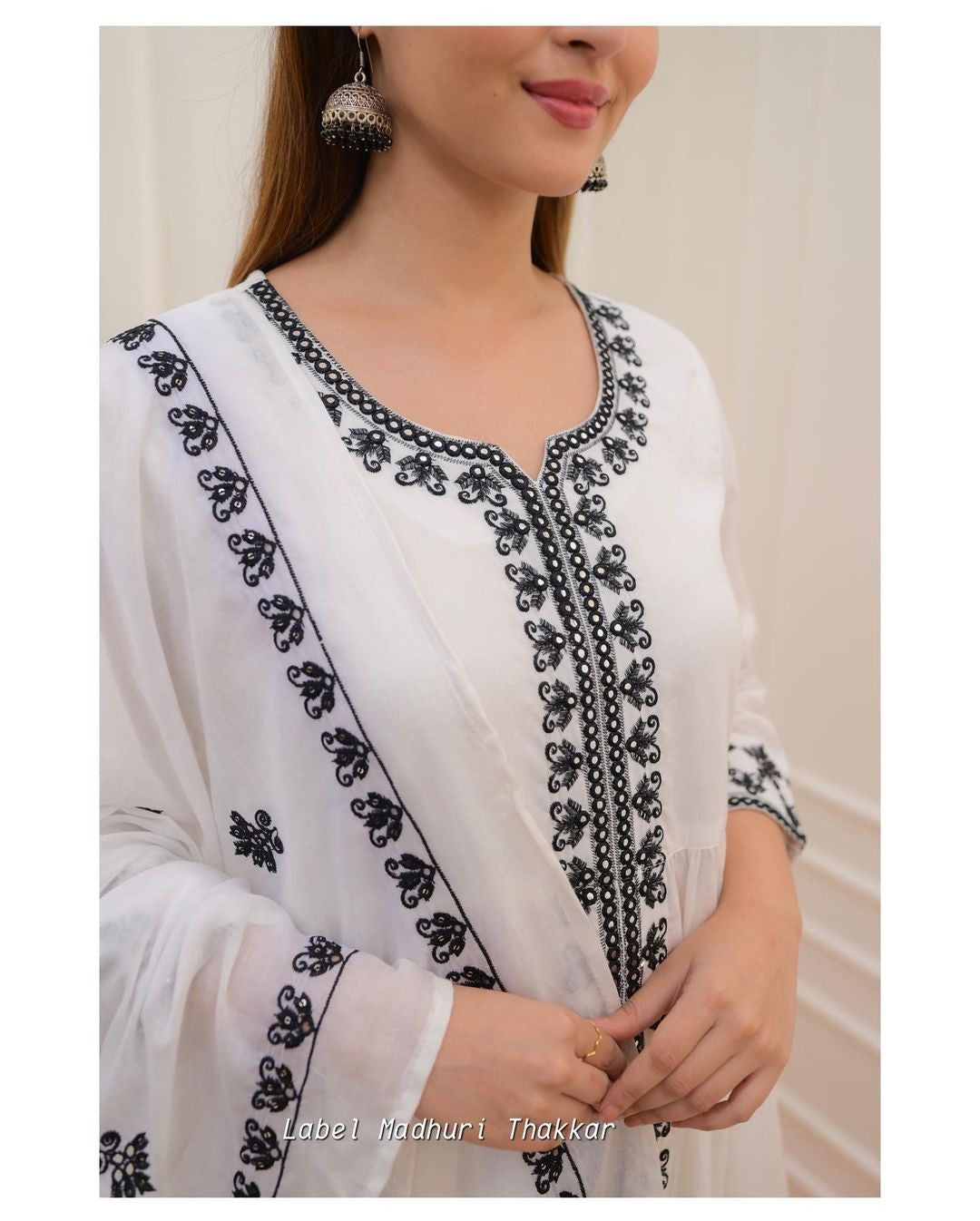 White Black Thread Embroidered A-Line Suit