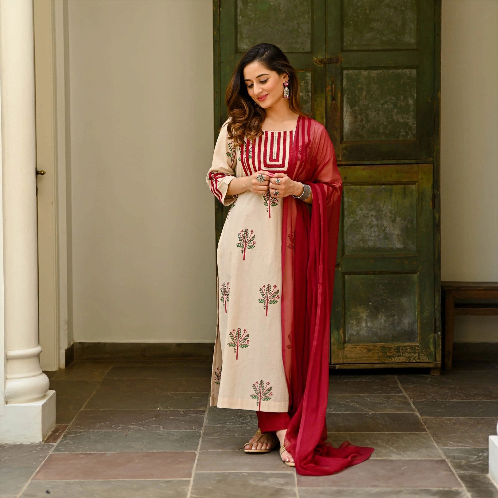 White Printed Fancy Kurti With Red Bottom & Dupatta set