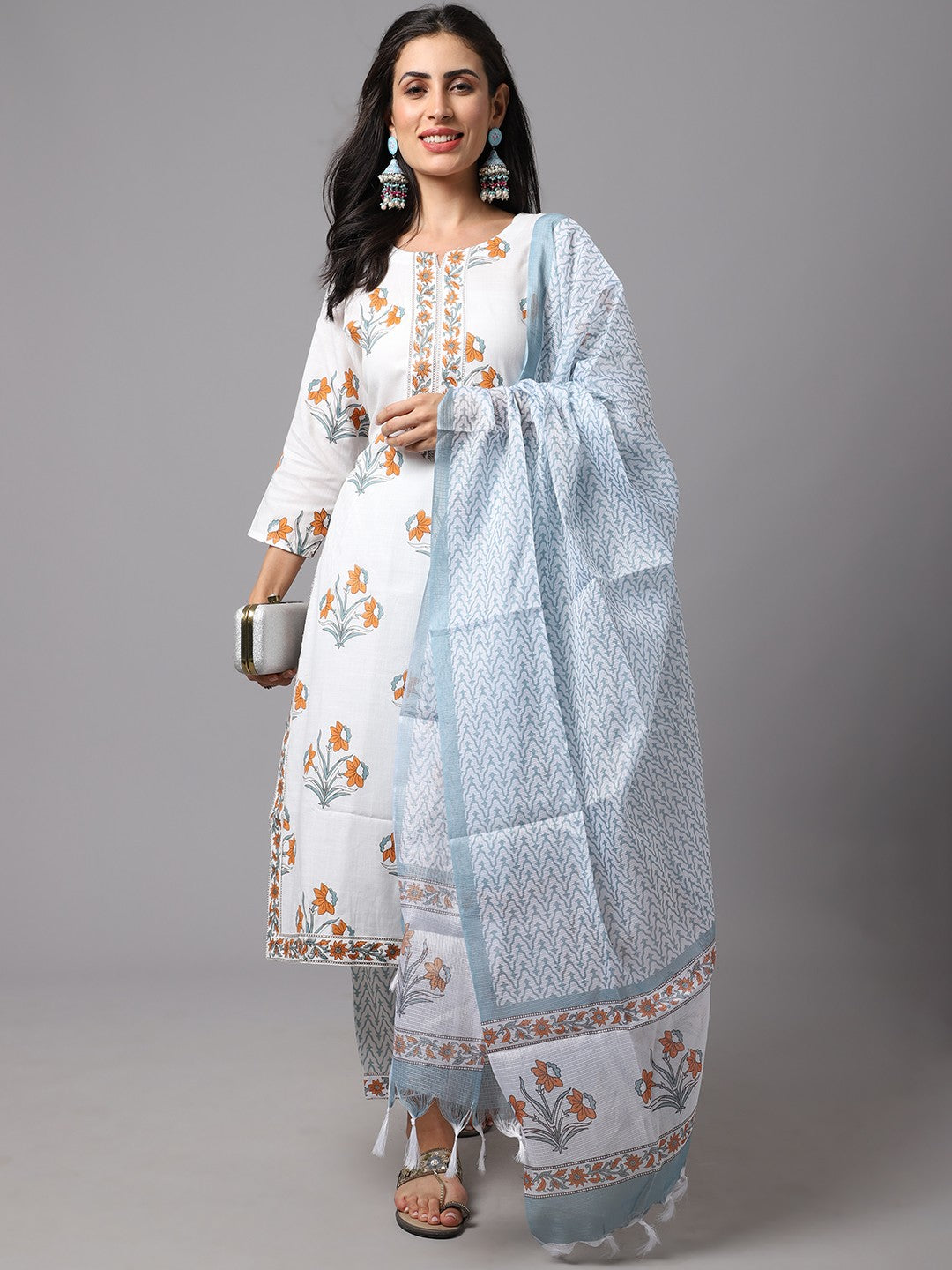 White Printed Fancy Kurti With White Bottom & Dupatta set