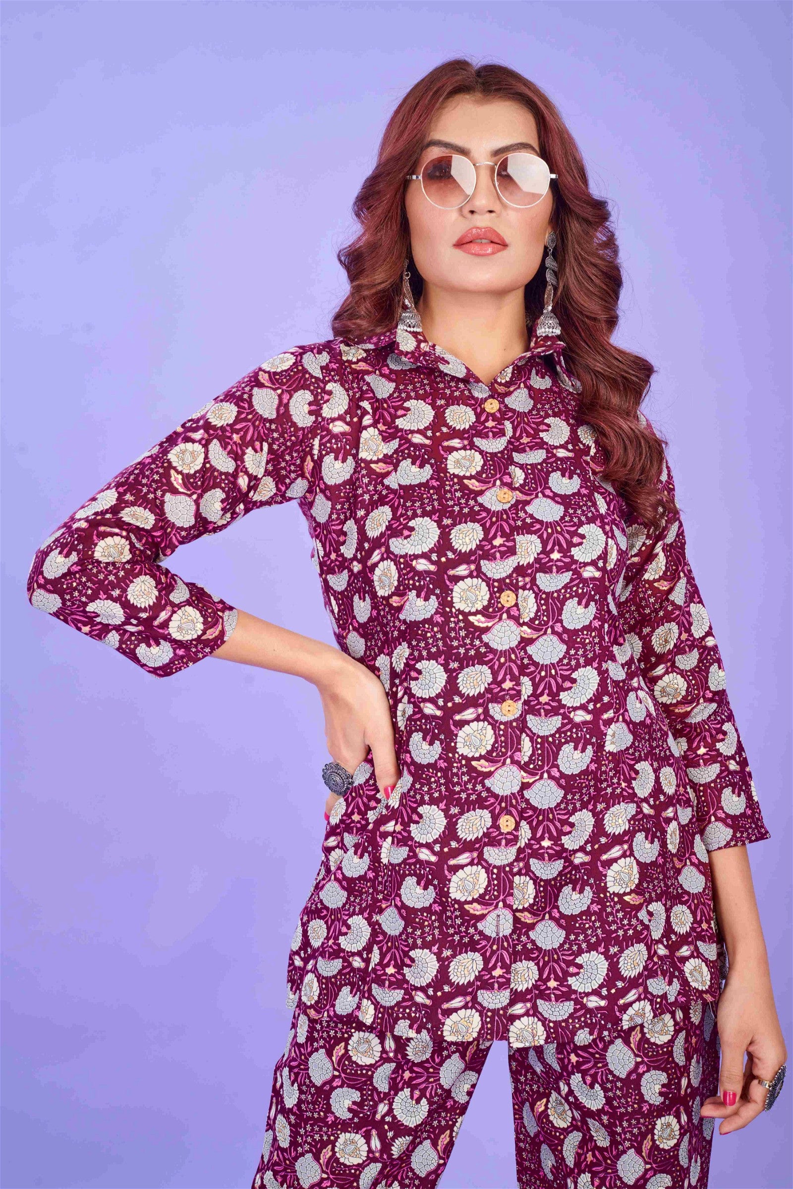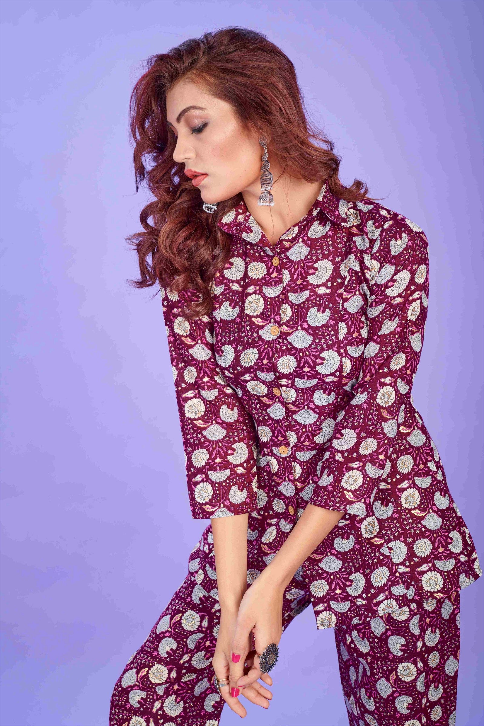 Wine Colour Cotton Printed Party Wear Co-ords Set
