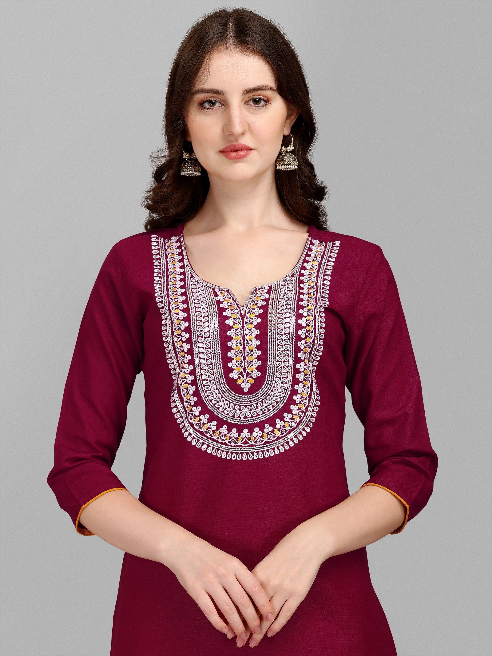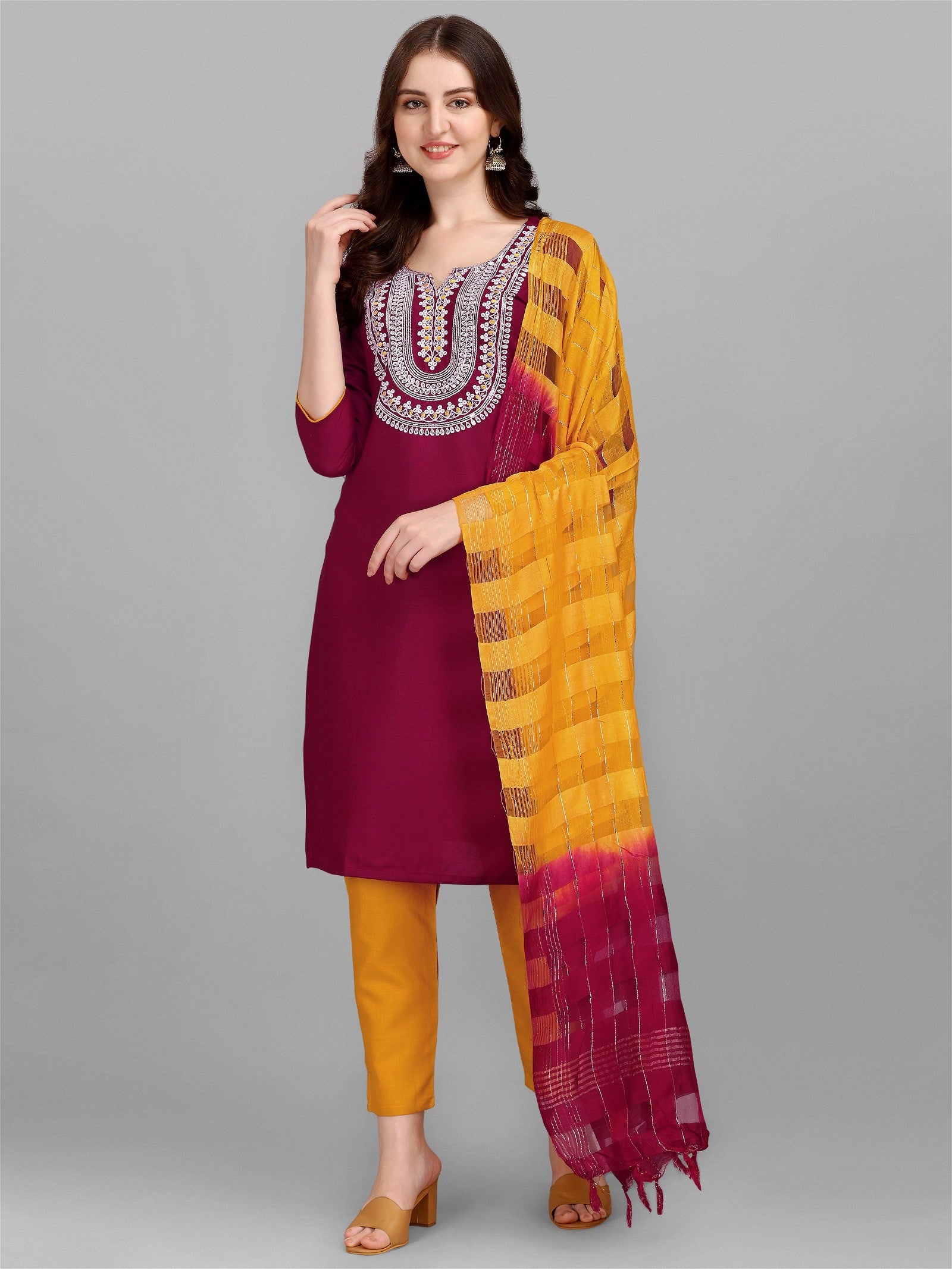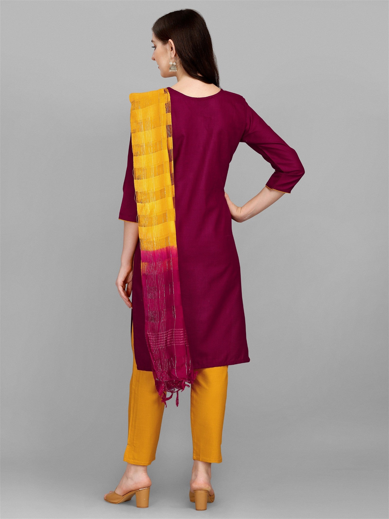 Wine Colour Slub Cotton Embroidery Kurta Pant Dupatta Set For Women's