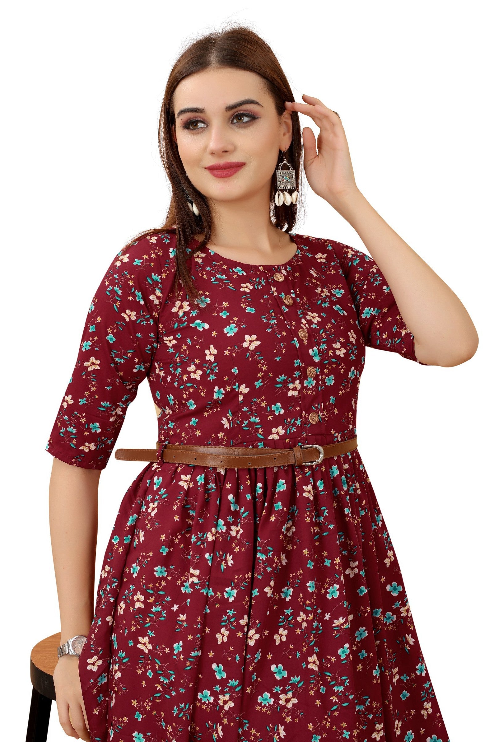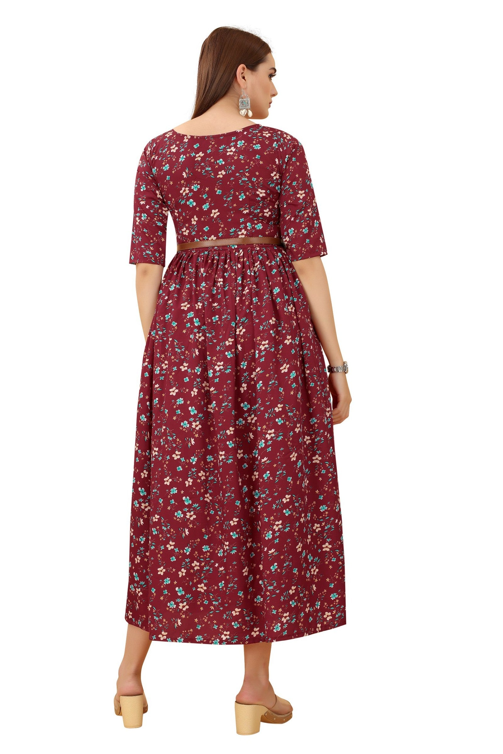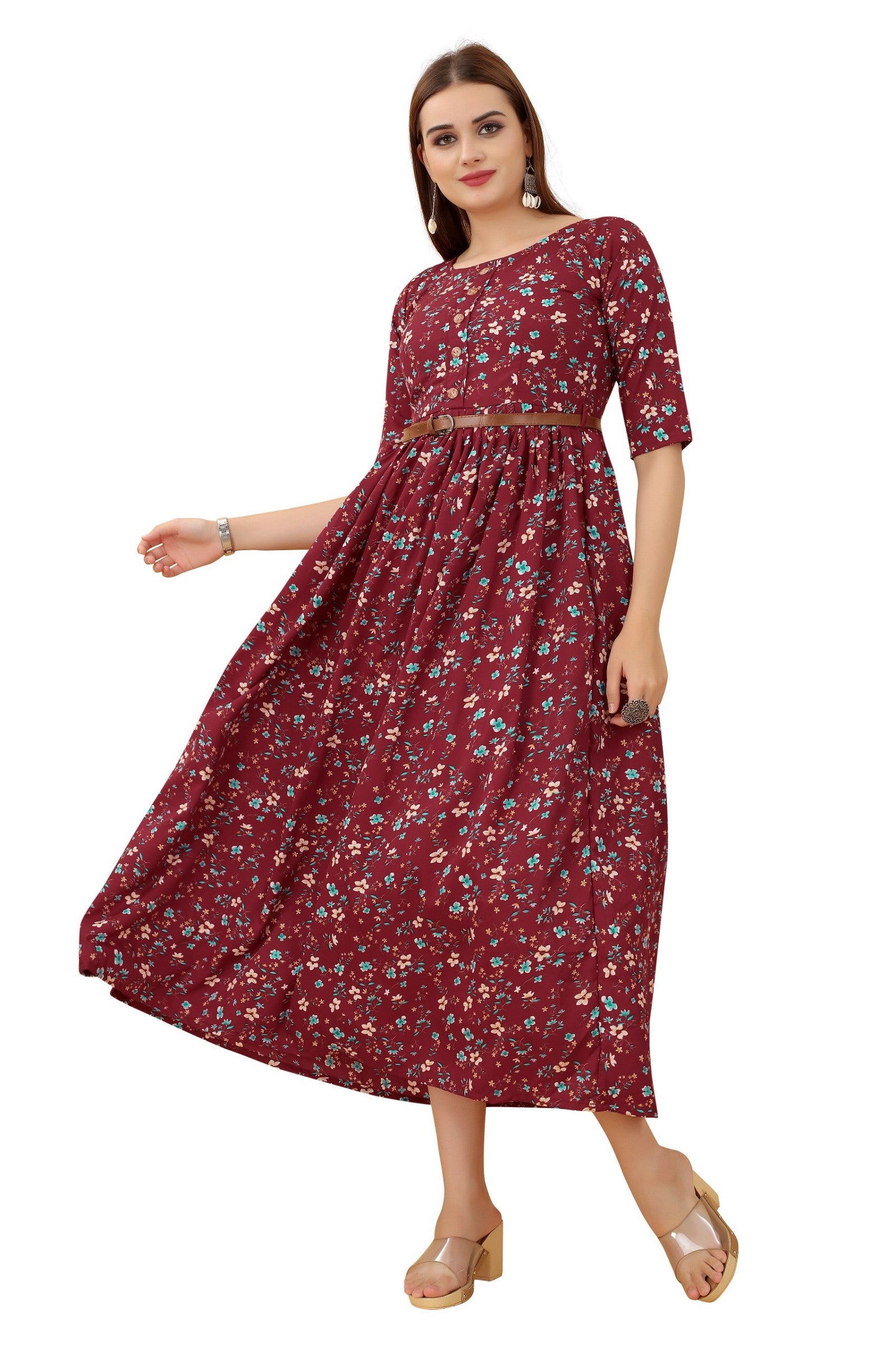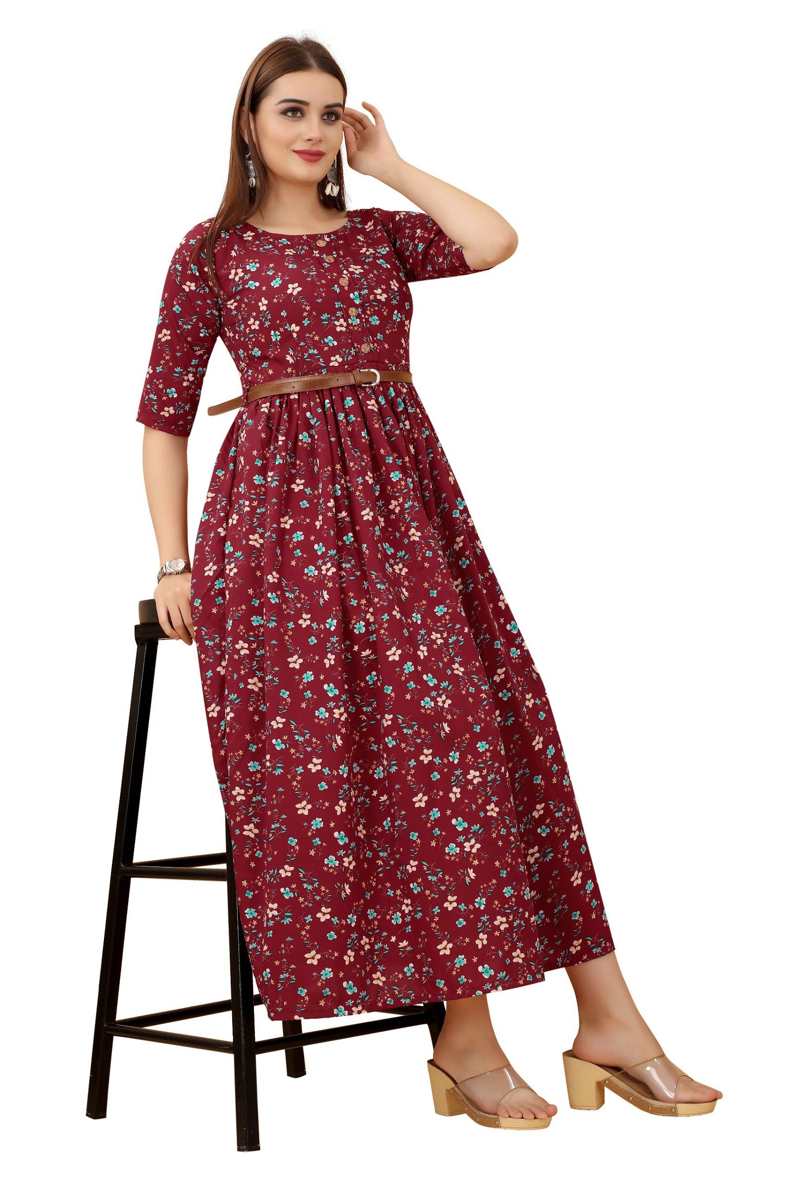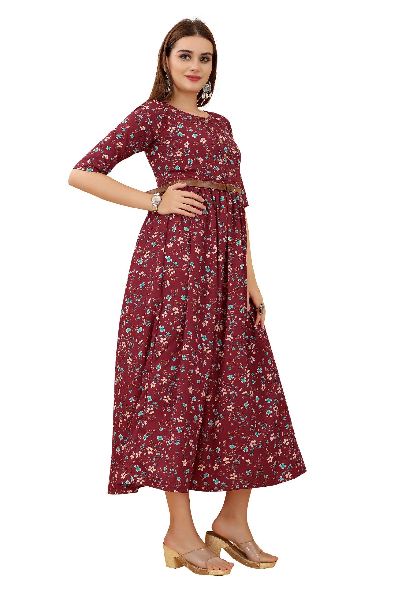Women's Maroon Colour Crepe Printed Casual Wear Dress