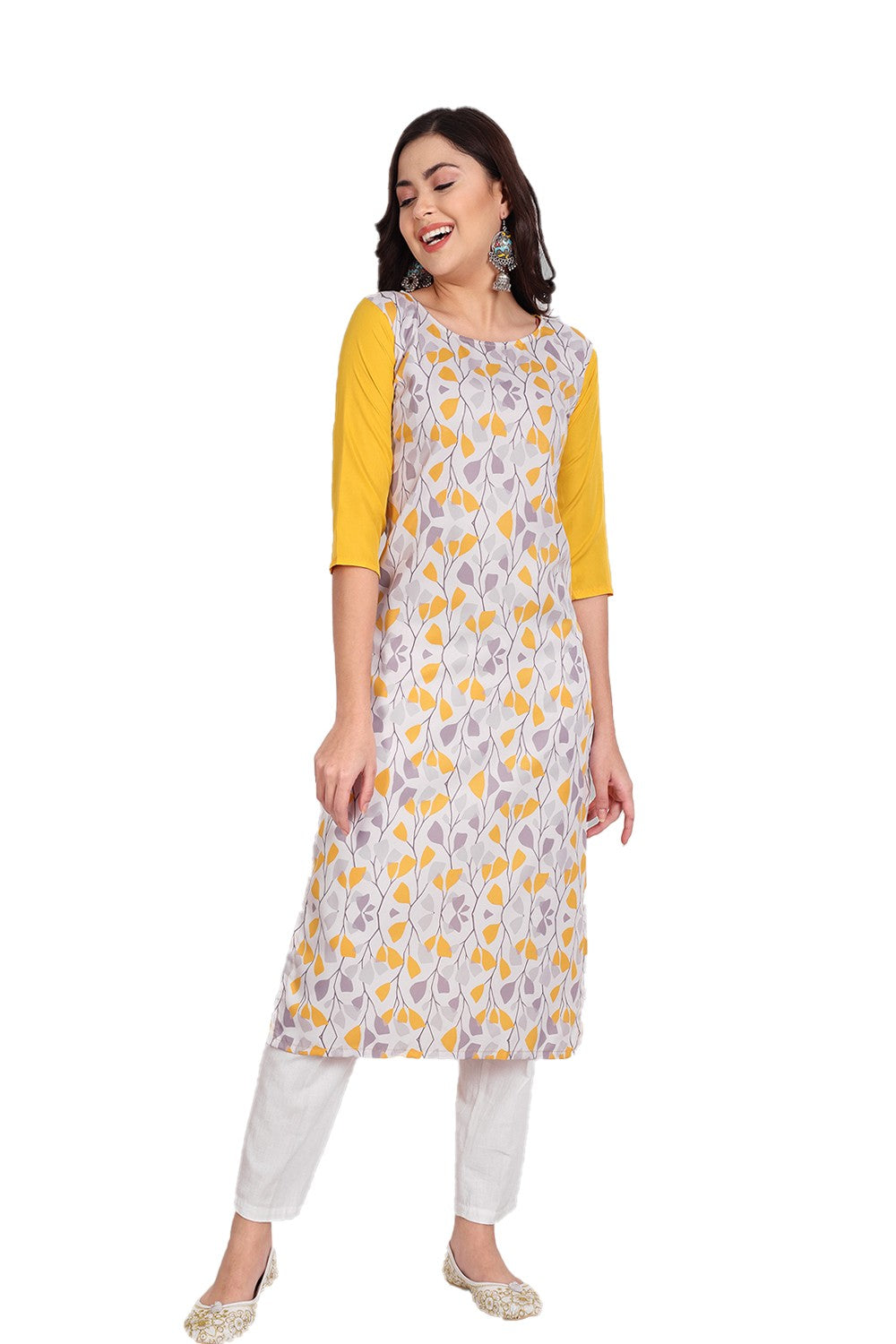 Women's Yellow Colour Printed Crepe Straight Kurti