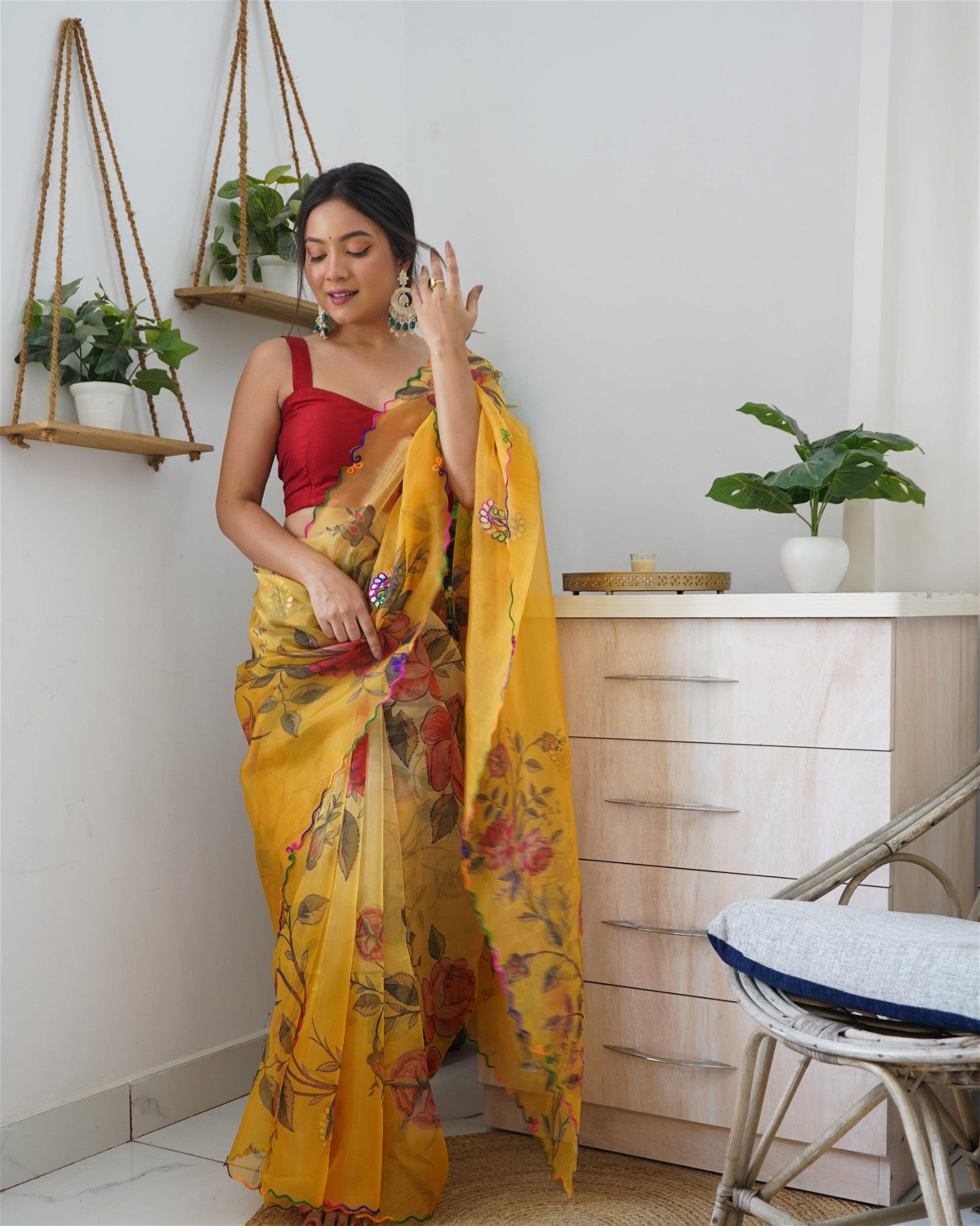 Yellow Colour Organza Digital Print With Gota Patti Work Saree For Women's