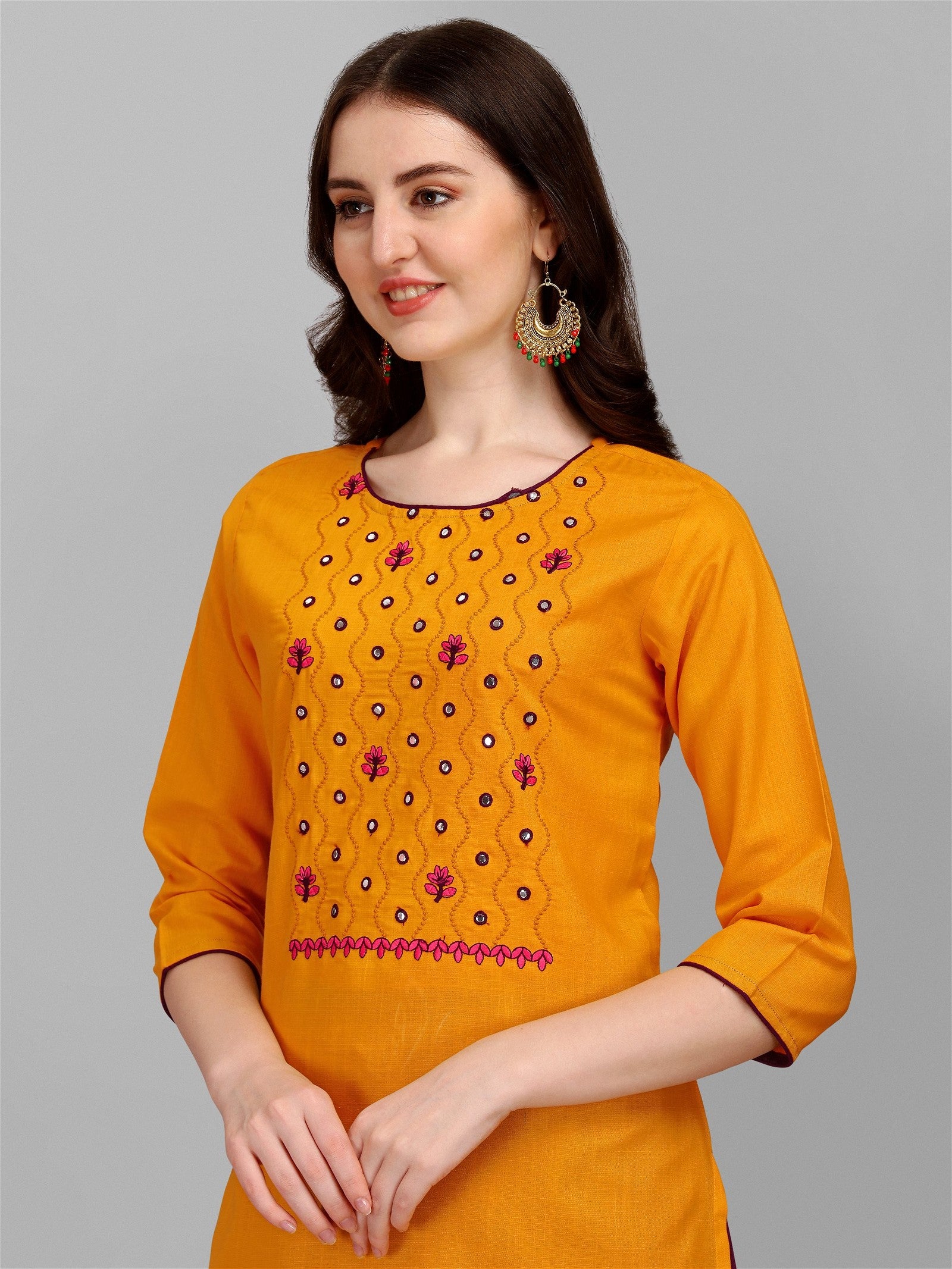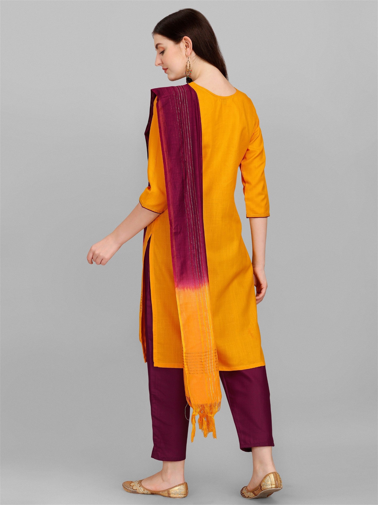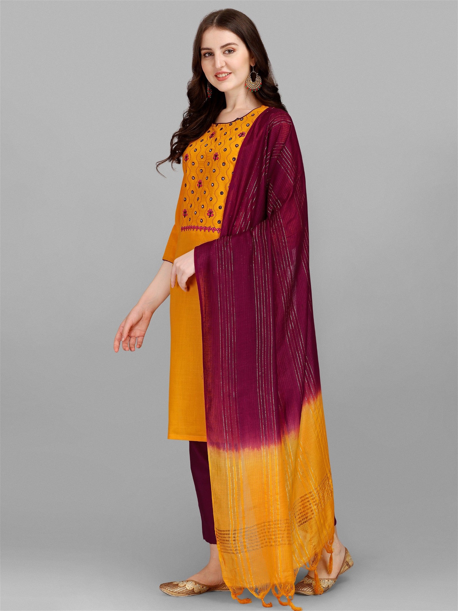 Yellow Colour Slub Cotton Embroidery Work Casual Wear Kurta Pant Dupatta Set For Women's