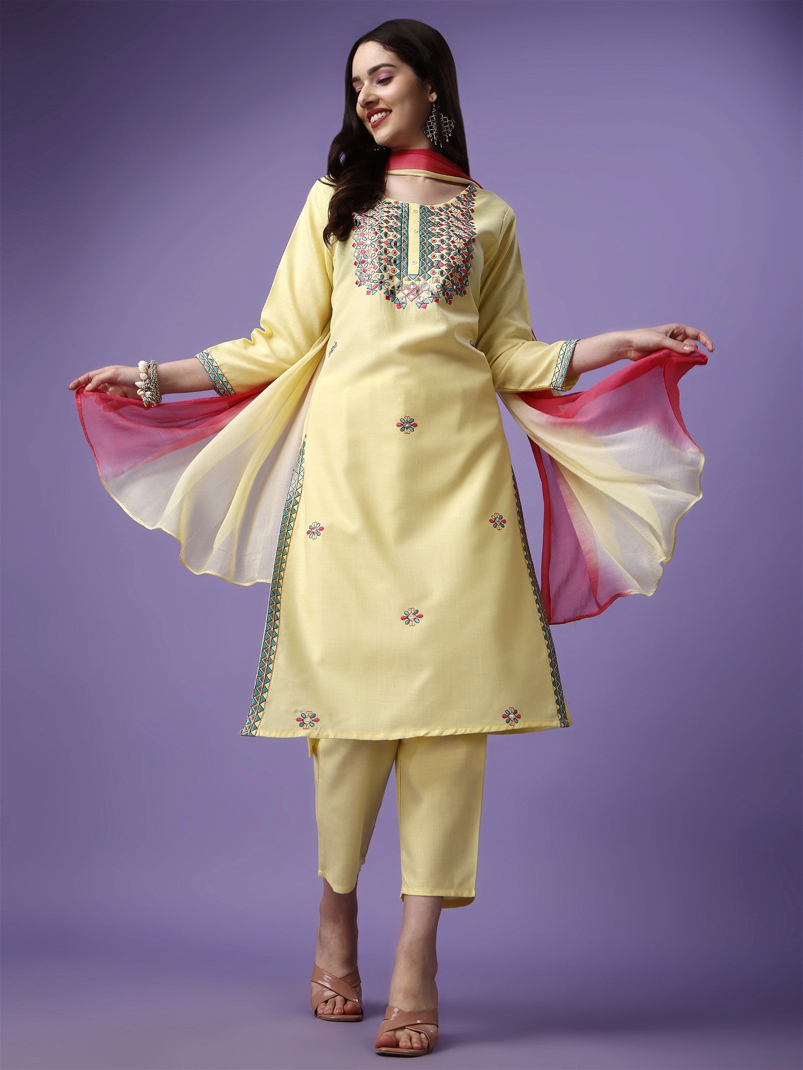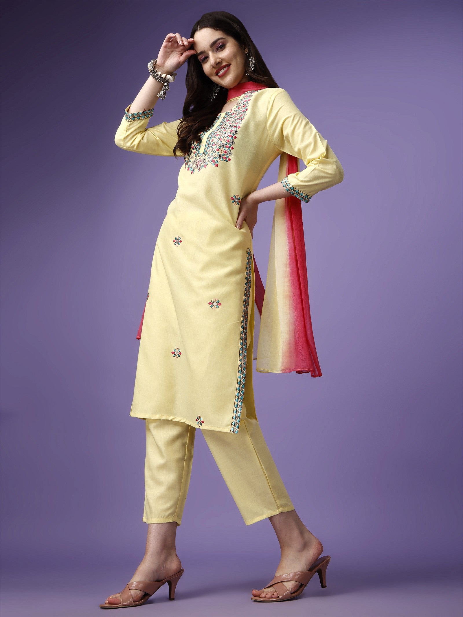 Yellow Party Wear Embroidery Worked Kurta With Pant And Duppata Set